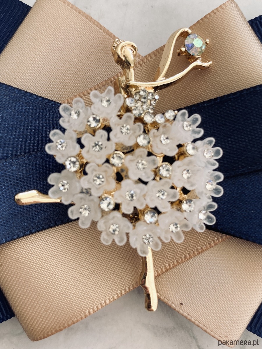 Niesamowicie subtelna ozdoba biżuteryjna na środku. Baletnica wykonana z delikatnych kwiatuszków z cyrkoniami.