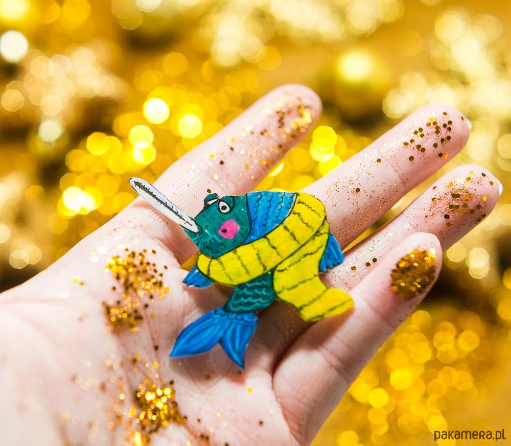 Zapakowany w ekologiczny, tekturowy kartonik – gotowy, by zamieszkać na Twojej kurtce, torbie albo kapeluszu i opowiadać swoją smutno-zabawną rybią historię.