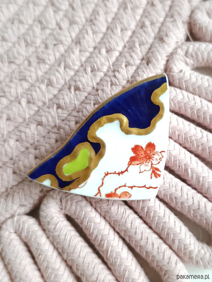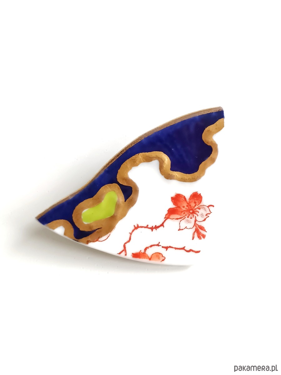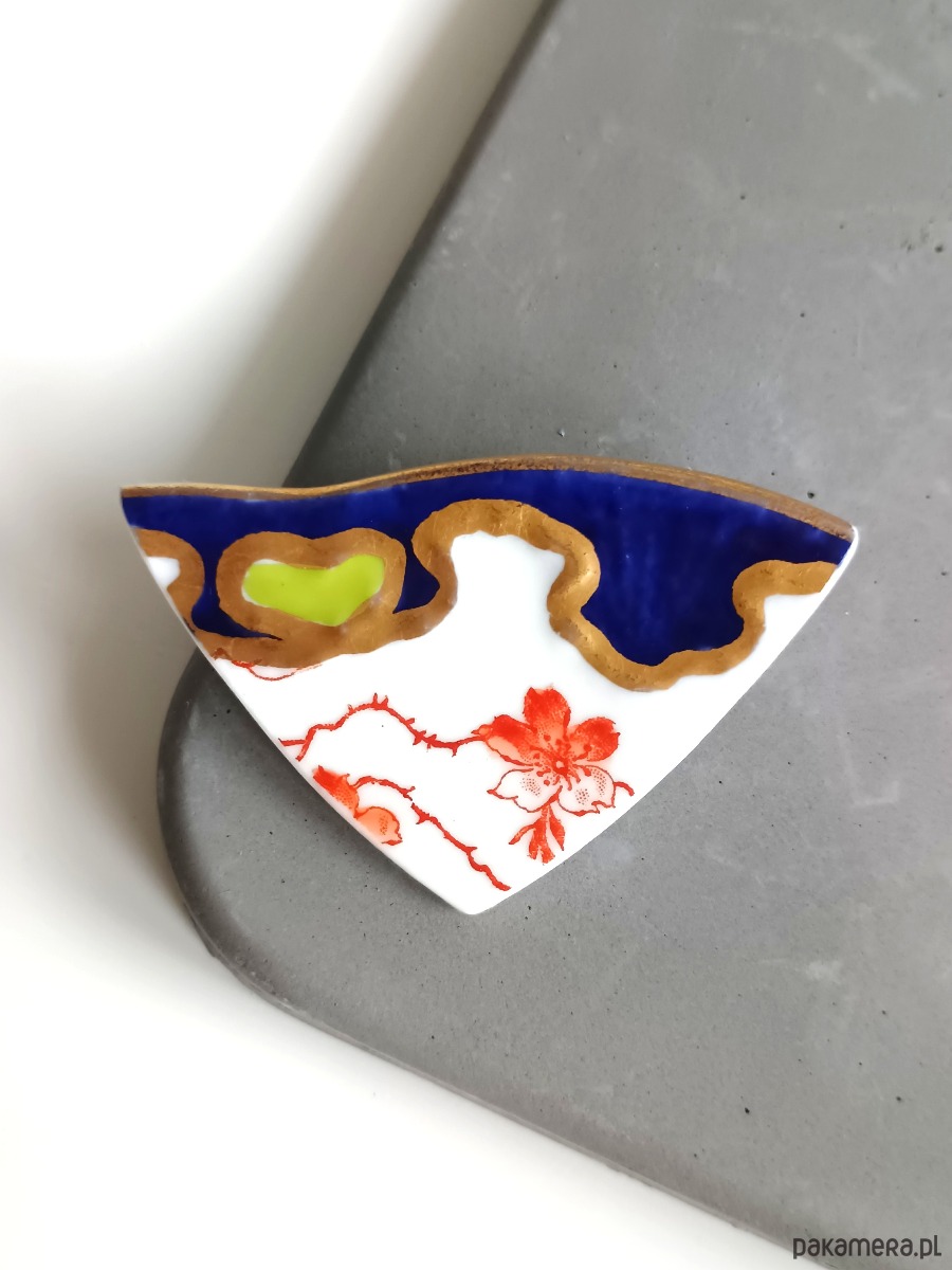 Trójkątna broszka, którą wykonałam z fragmentu stłuczonego talerza w czrwone kwiaty i ze złotym wzorem dookoła rantu. Kawałek stłuczki oszlifowałam i połączyłam z metalowym zapięciem. Ceramikę zeszlifowałam również z grubości - jest cieńsza niż pierwotnie, dzięki czemu przypinka nie jest ciężka. Brzegi i tył pokryłam lakierem, co sprawia, że nie brudzą się i nie chłoną wilgoci. Wymiary elementu ceramicznego: 33 x 52 mm. Unikat - każdy z moich wyrobów występuje w jednym egzemplarzu. Upcykling - nie reprodukuję wykorzystywanych wzorów, niczego nie domalowuję - wykorzystuję wyłącznie oryginalne naczynia i motywy, które się na nich znajdują. Tym samym, stłuczce z odzysku nadaję nowe życie.