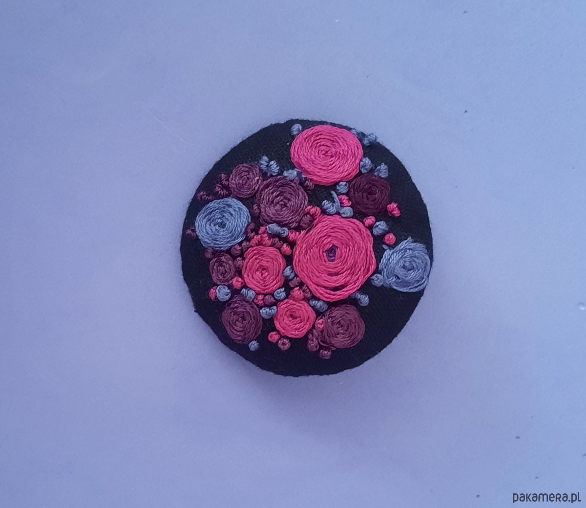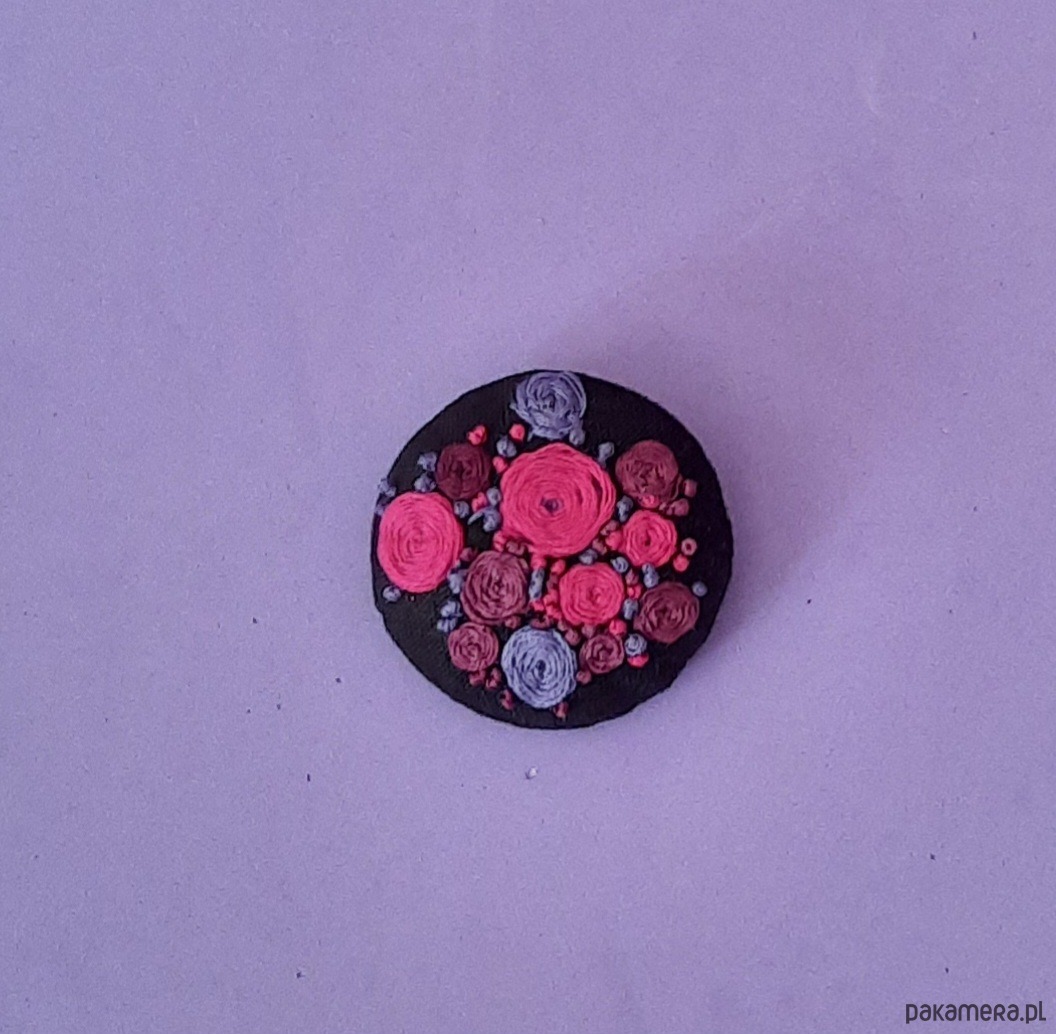 Piękna broszka z misternym haftem w tonacji fioletowo - różowej. Do haftu użyto muliny najwyższej jakości na materiale ze 100% bawełny.