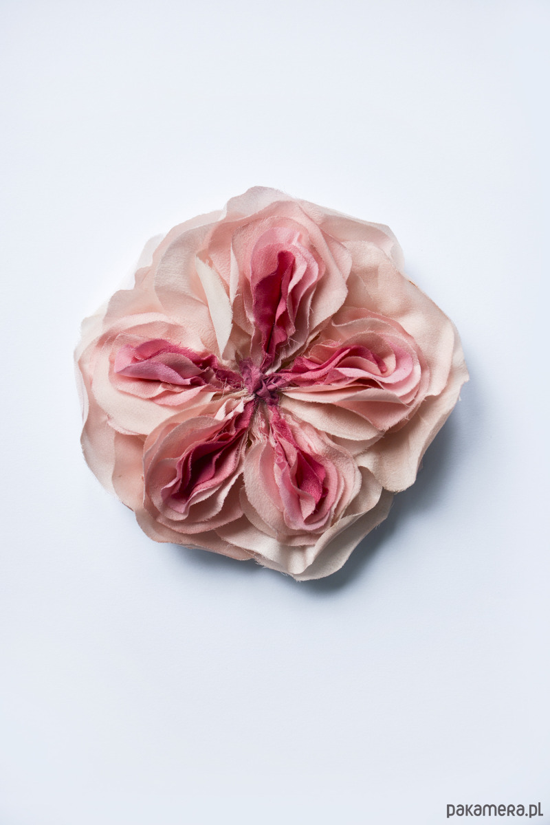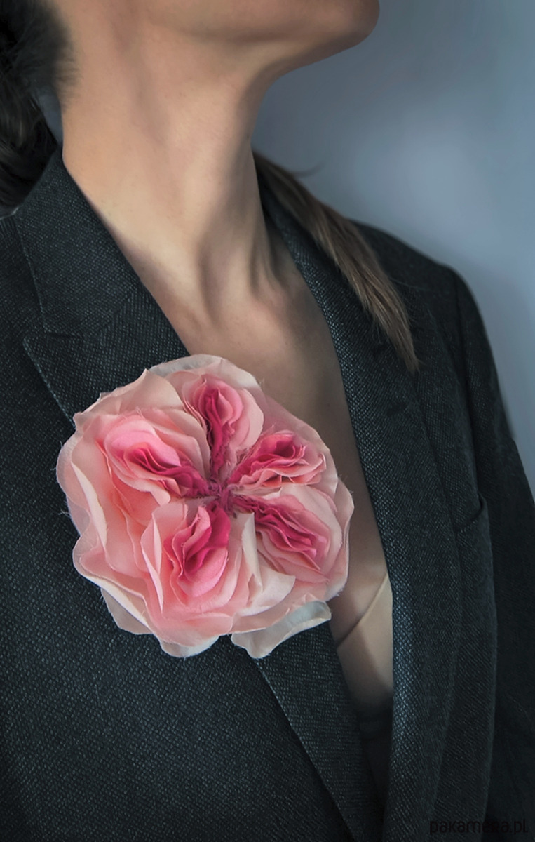 Broszka z unikatowym jedwabnym kwiatem w odcieniach różu.