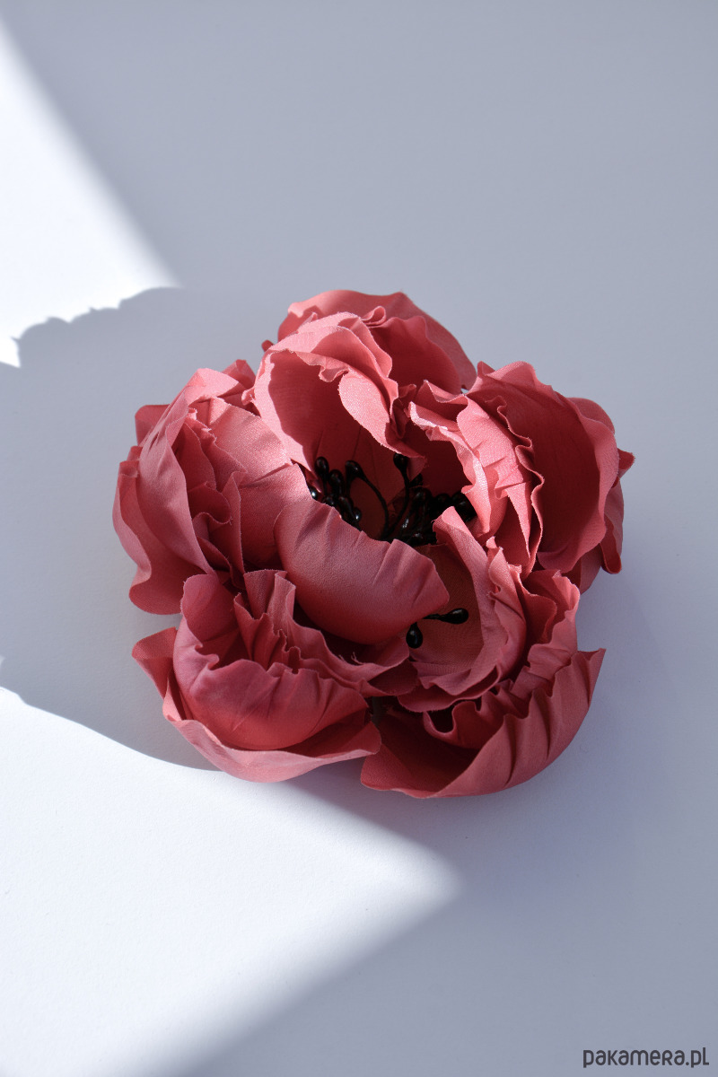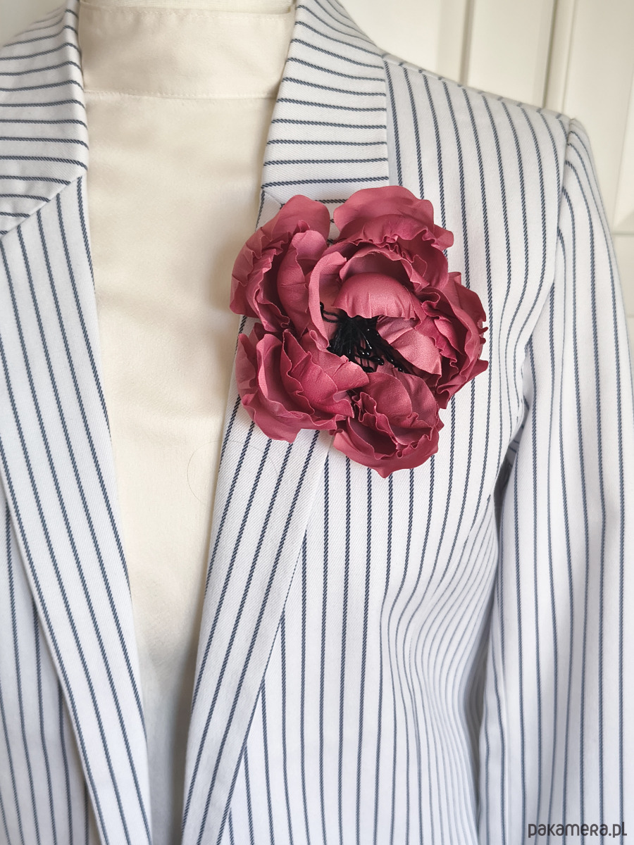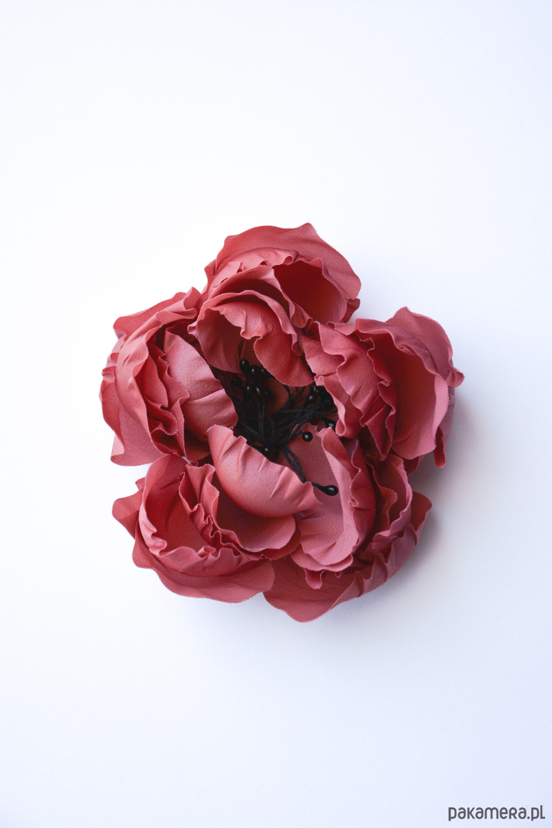 Broszka z jedwabnym kwiatem w kolorze zgaszonego, brudnego ciemnego różu. Wykonana jest z kilku warstw jedwabiu, środek wykonany jest z pręcików w czarnym kolorze. Każdy płatek jest ręcznie wycinany i formowany specjalnymi narzędziami. Jest to idealna ozdoba zarówno do codziennych jak i wieczorowych stylizacji. Pięknie komponuje się z jasnymi kolorami.