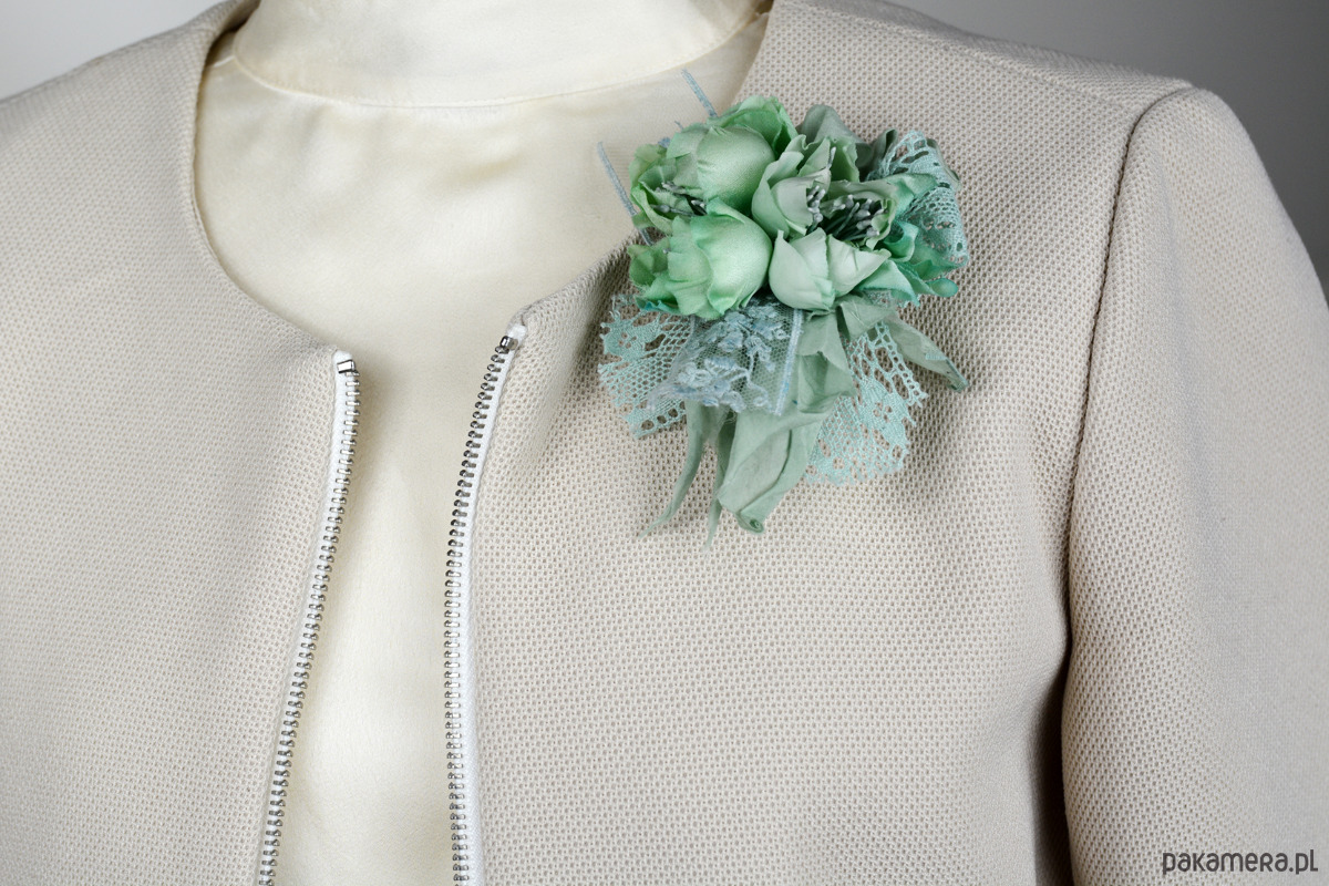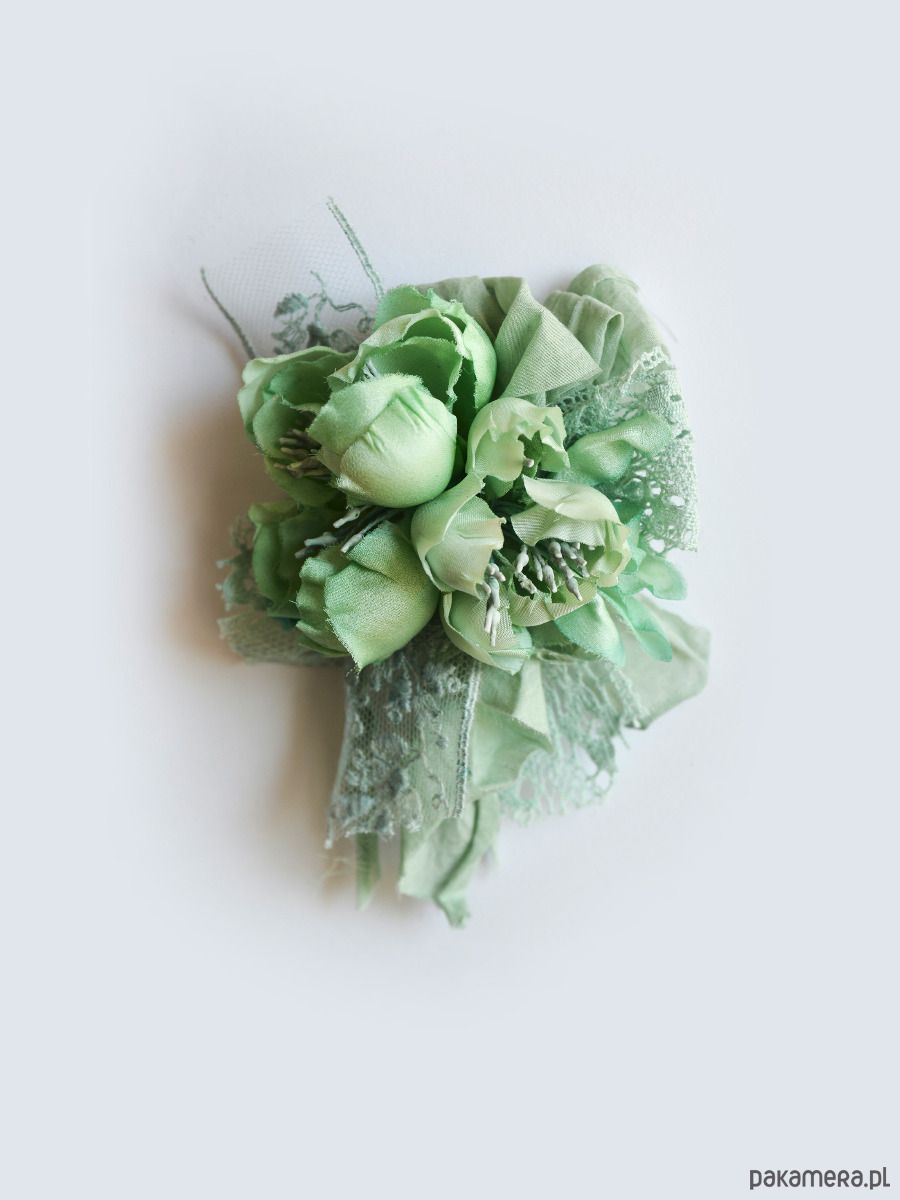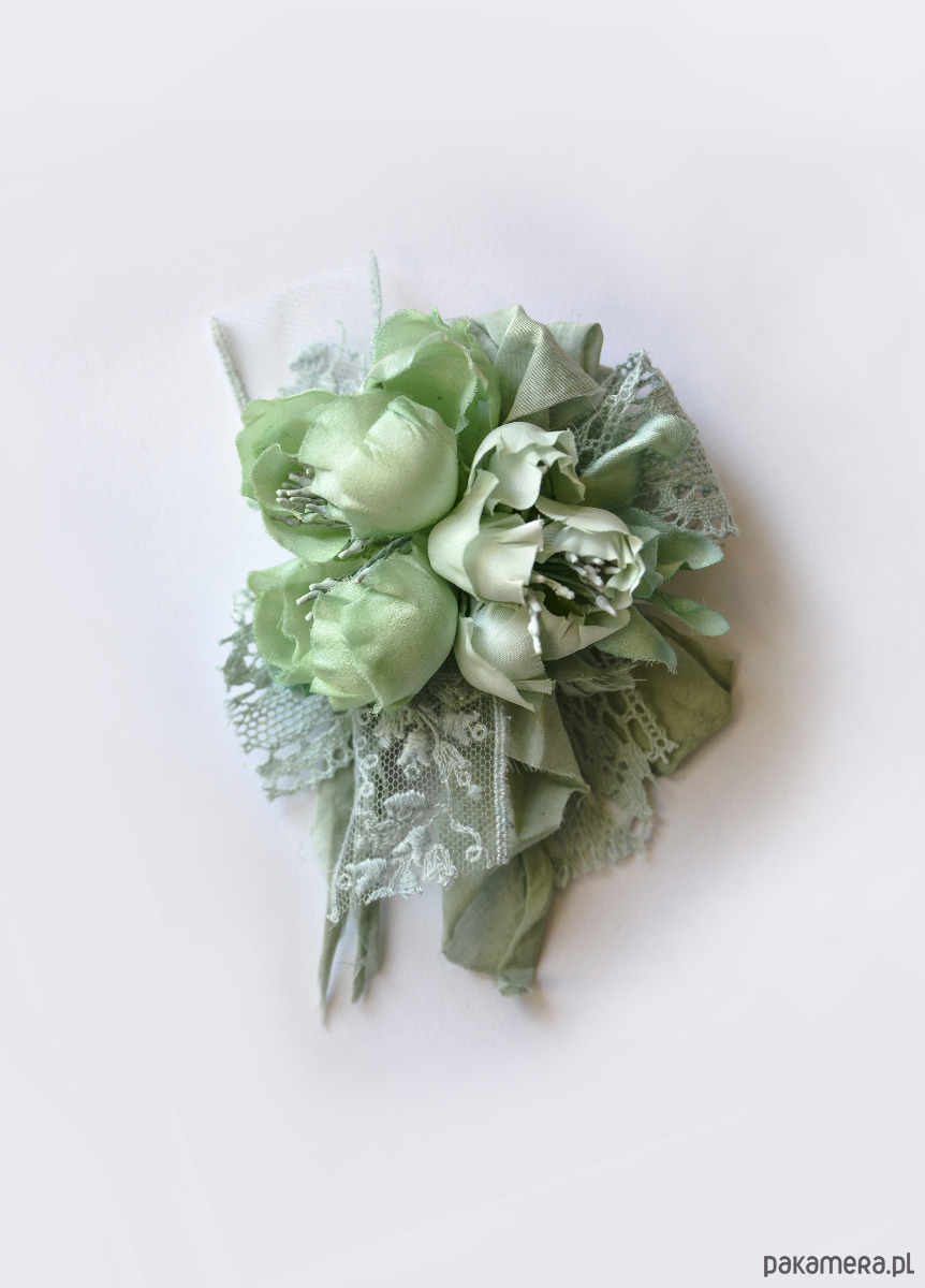 Broszka z jedwabnymi kwiatami w odcieniach mięty