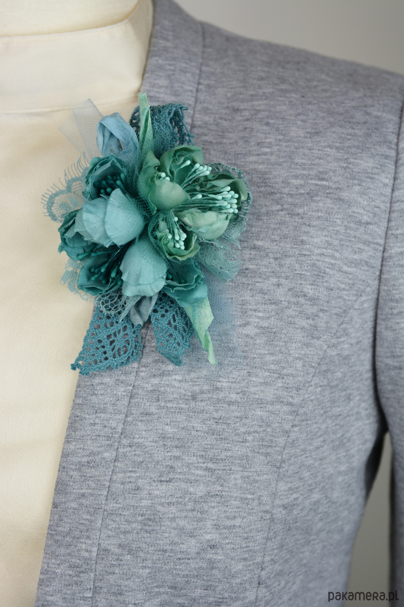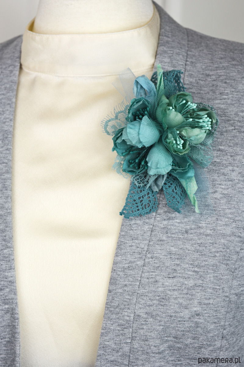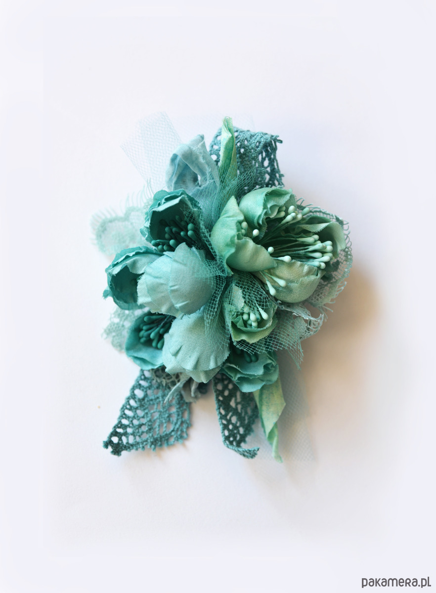 Broszka z jedwabnymi kwiatami w odcieniach turkusu