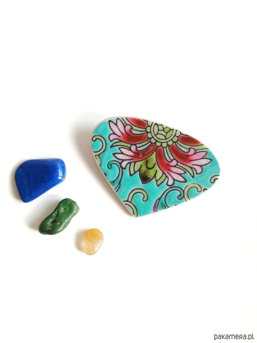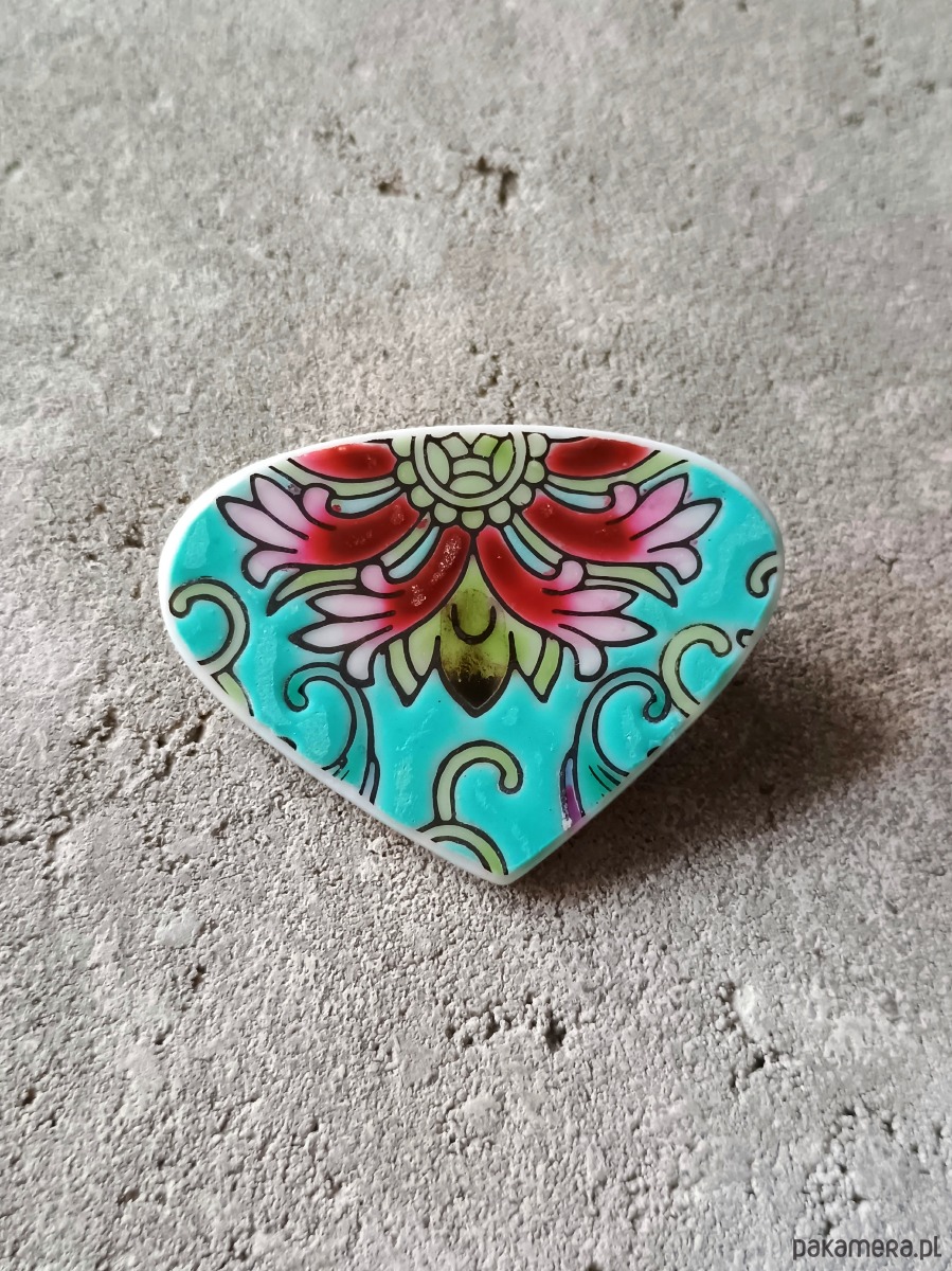 Oryginalna broszka, którą wykonałam z fragmentu stłuczonego talerza z chńskiej porcelany w kolorowe kwiaty. Kawałek stłuczki oszlifowałam w opływowy trójkątny kształt i połączyłam z metalowym zapięciem. Ceramikę zeszlifowałam również z grubości - jest cieńsza niż pierwotnie, dzięki czemu przypinka nie jest ciężka. Brzegi i tył pokryłam lakierem, co sprawia, że nie brudzą się i nie chłoną wilgoci. Wymiary elementu ceramicznego: 32 x 44 mm. Unikat - każdy z moich wyrobów występuje w jednym egzemplarzu. Upcykling - nie reprodukuję wykorzystywanych wzorów, niczego nie domalowuję - wykorzystuję wyłącznie oryginalne naczynia i motywy, które się na nich znajdują. Tym samym, stłuczce z odzysku nadaję nowe życie.