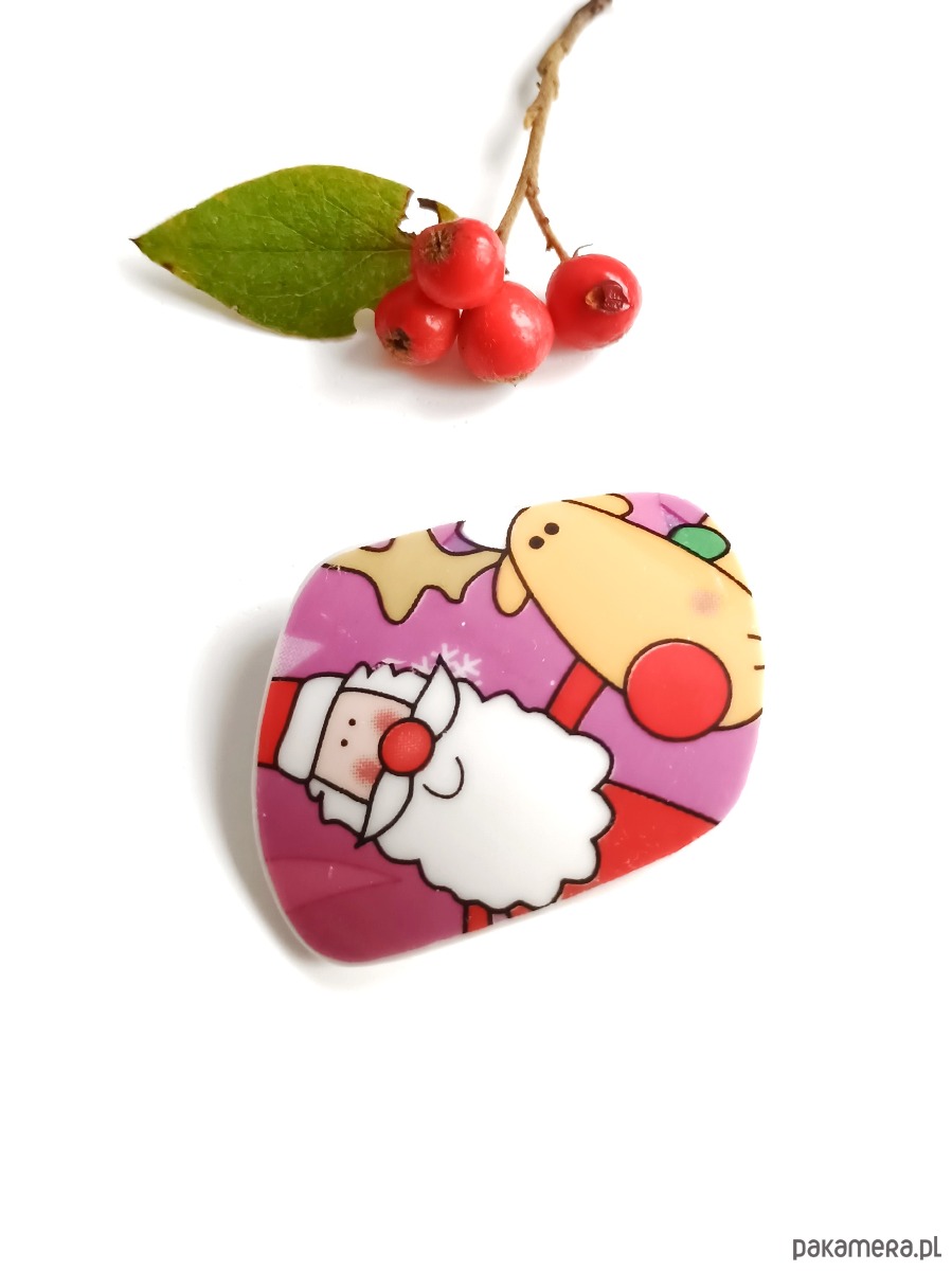 Broszka, którą wykonałam z fragmentu stłuczonego kubka w motywy gwiazdkowe. Kawałek stłuczki oszlifowałam w opływowy prostokątny kształt i połączyłam z metalowym zapięciem. Ceramikę zeszlifowałam również z grubości, dzięki czemu przypinka nie jest ciężka. Brzegi i tył pokryłam lakierem, co sprawia, że nie brudzą się i nie chłoną wilgoci. Wymiary elementu ceramicznego: 33 x 42 mm. Unikat - każdy z moich wyrobów występuje w jednym egzemplarzu. Upcykling - nie reprodukuję wykorzystywanych wzorów, niczego nie domalowuję - wykorzystuję wyłącznie oryginalne naczynia i motywy, które się na nich znajdują. Tym samym, stłuczce z odzysku nadaję nowe życie.
