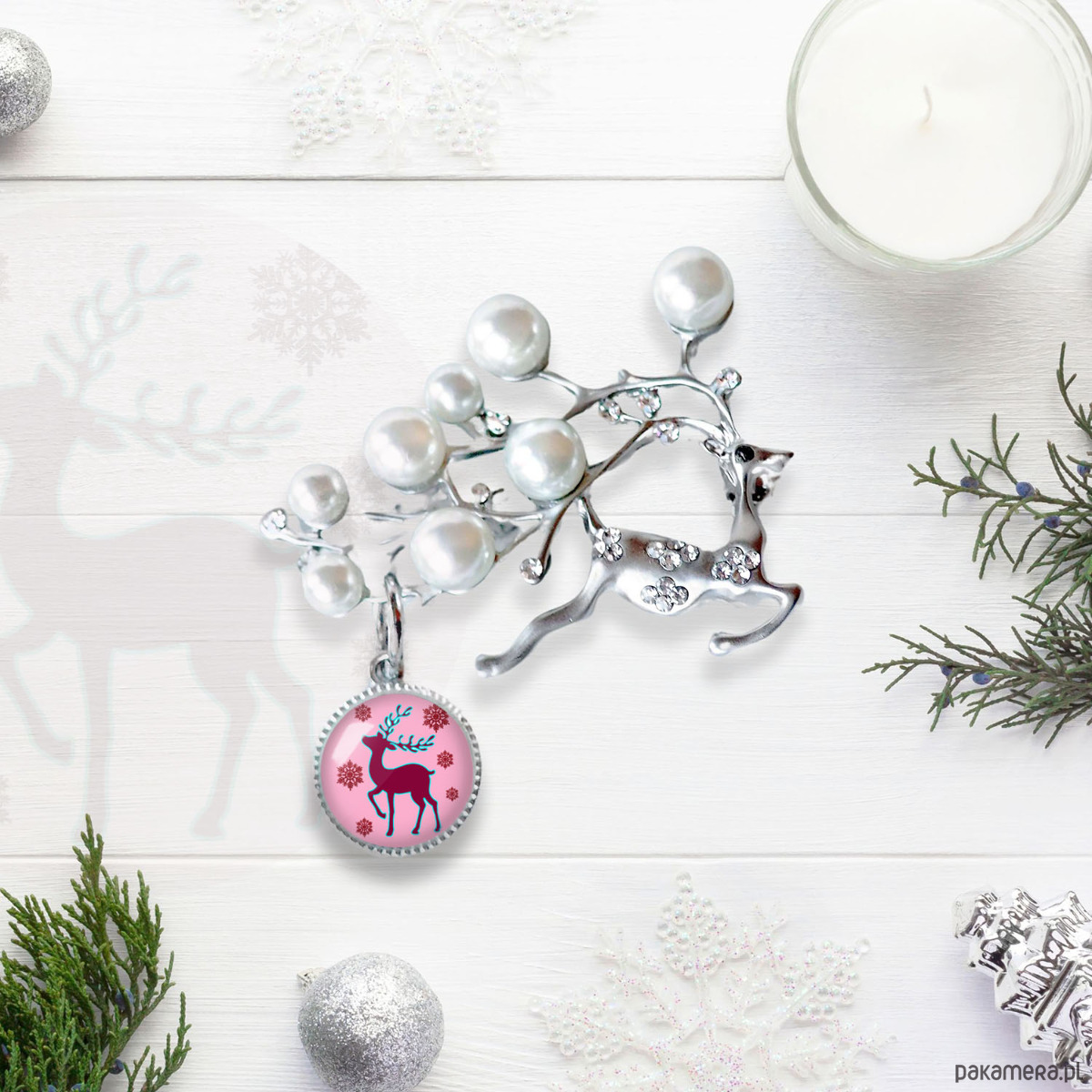 Efektowna broszka w kształcie renifera w kolorze matowego srebra, wysadzana perełkami i kryształkami. Dodatkową ozdobę stanowi zawieszka z unikalną grafiką artystyczną umieszczoną pod wypukłym szkłem nadającym grafice efekt głębi. Pięknie ozdobi Twój ubiór- bluzkę, sweterek, żakiet a także szal lub czapkę. Grafika w szkle jest najwyższej jakości.