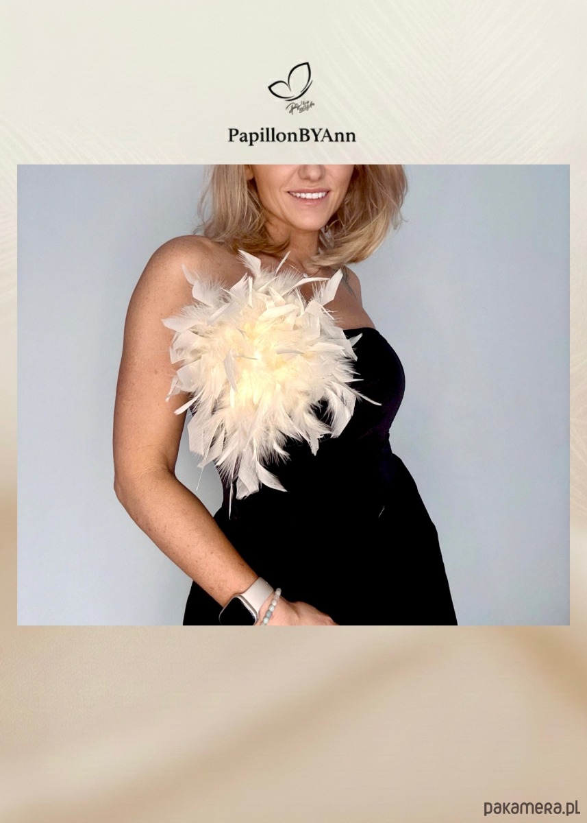 Ta broszka, jednocześnie fascynator do włosów, wykonana jest z delikatnych strusich piórek, które sprawią, że nawet najprostsza koszula, marynarka, sukienka czy t-shirt nabiorą stylowego charakteru z nutą zmysłowości. Doskonała do podkreślenia wieczorowego charakteru ubrania lub dla odświeżenia codziennego looku. To niezwykle modny dodatek, który pięknie faluje w ruchu!