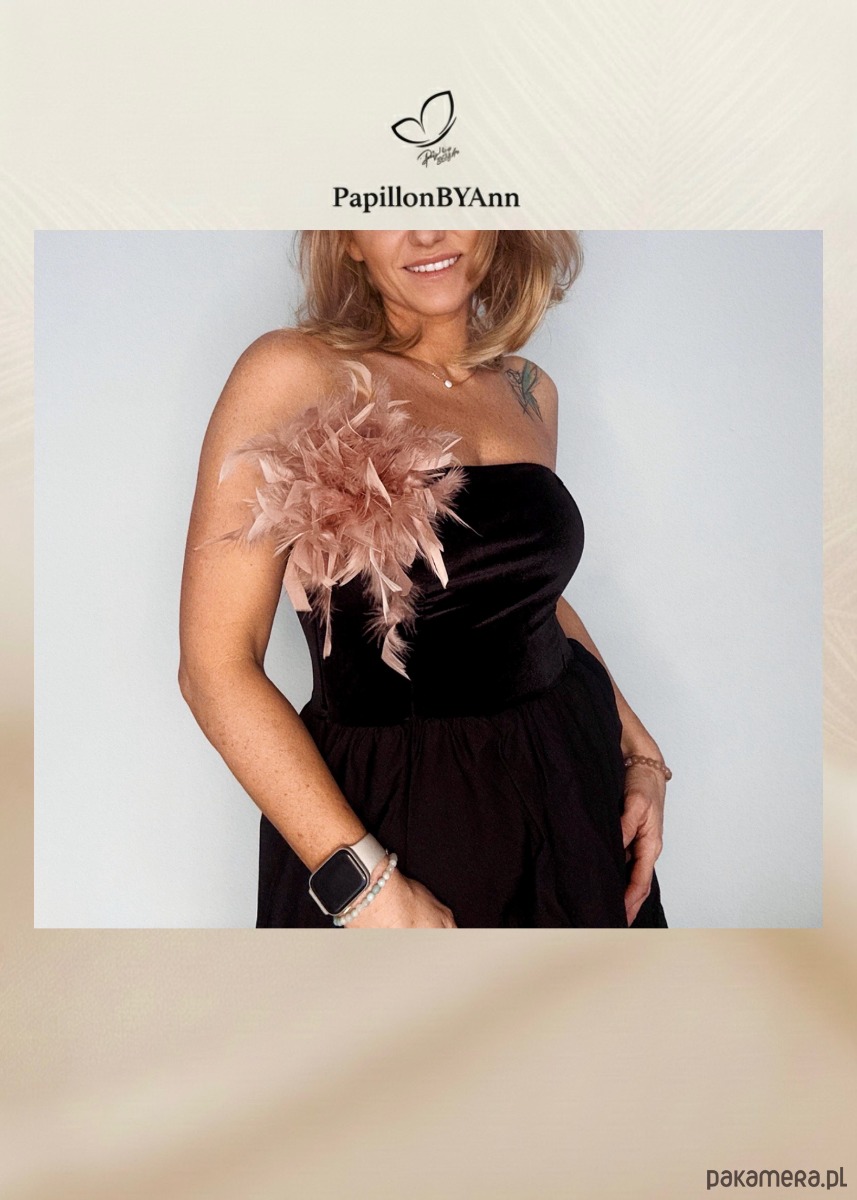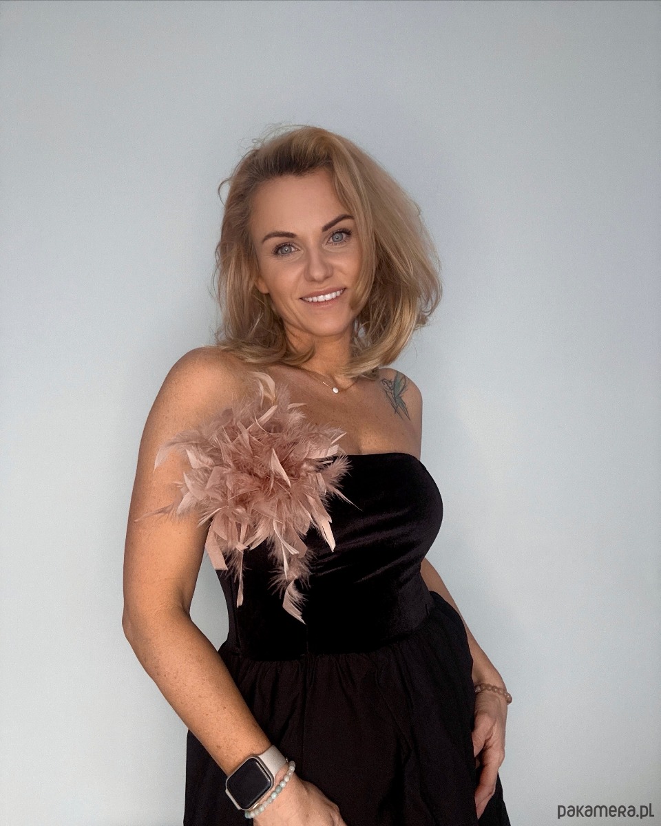 Ta broszka, jednocześnie fascynator do włosów, wykonana jest z delikatnych strusich piórek, które sprawią, że nawet najprostsza koszula, marynarka, sukienka czy t-shirt nabiorą stylowego charakteru z nutą zmysłowości. Doskonała do podkreślenia wieczorowego charakteru ubrania lub dla odświeżenia codziennego looku. To niezwykle modny dodatek, który pięknie faluje w ruchu!