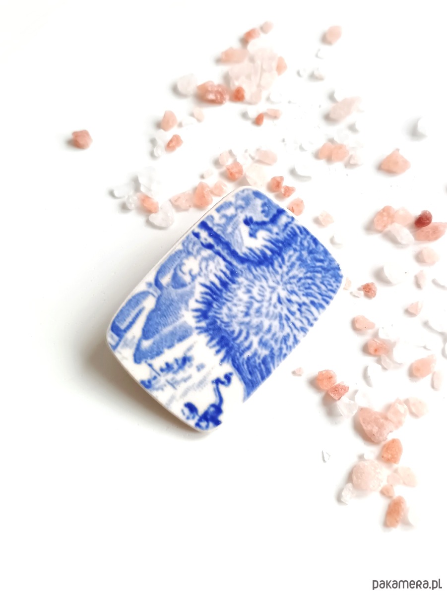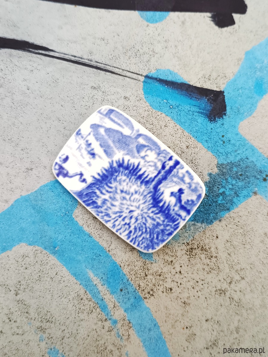 Prostokątna broszka, którą wykonałam z fragmentu stłuczonego talerza Villeroy & Boch z motywem pejzażu z postacią i kozą w kolorze kobaltowym. Kawałek stłuczki oszlifowałam i połączyłam z metalowym zapięciem. Ceramikę zeszlifowałam również z grubości - jest cieńsza niż pierwotnie, dzięki czemu przypinka nie jest ciężka. Brzegi i tył pokryłam lakierem, co sprawia, że nie brudzą się i nie chłoną wilgoci. Wymiary elementu ceramicznego: 30 x 43 mm. Unikat - każdy z moich wyrobów występuje w jednym egzemplarzu. Upcykling - nie reprodukuję wykorzystywanych wzorów, niczego nie domalowuję - wykorzystuję wyłącznie oryginalne naczynia i motywy, które się na nich znajdują. Tym samym, stłuczce z odzysku nadaję nowe życie.