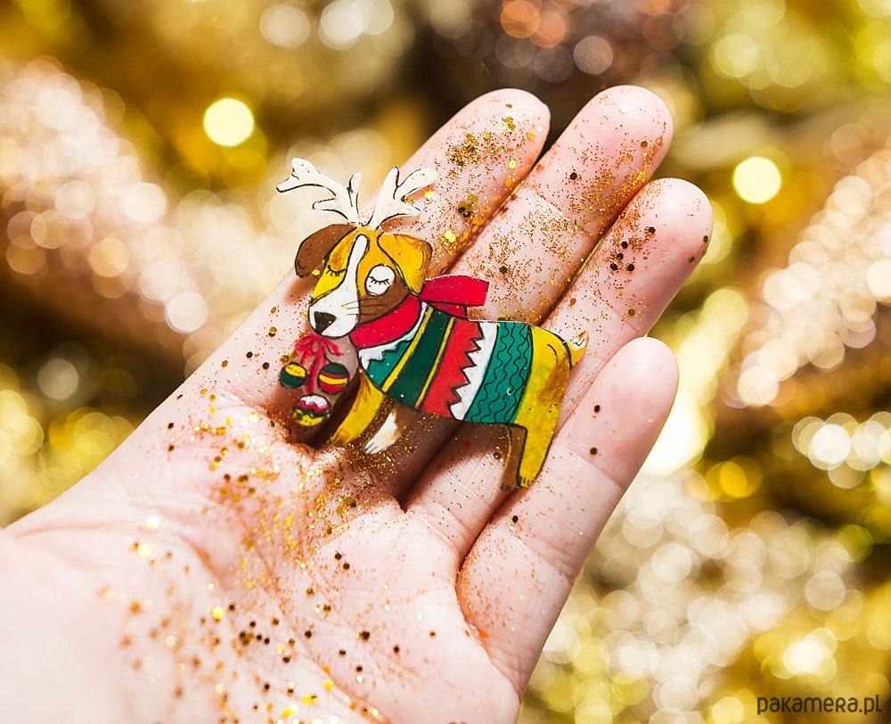 Ręcznie rysowana broszka przedstawiająca uroczego psa ubranego w świąteczny sweter. Delikatne, dopracowane detale nadają jej ciepły, zimowy charakter i sprawiają, że każdy egzemplarz jest wyjątkowy. Broszka zapakowana jest w estetyczny tekturowy kartonik, ozdobiony uroczą „psią” naklejką, dzięki czemu idealnie nadaje się na prezent dla miłośników zwierząt i świątecznej atmosfery.