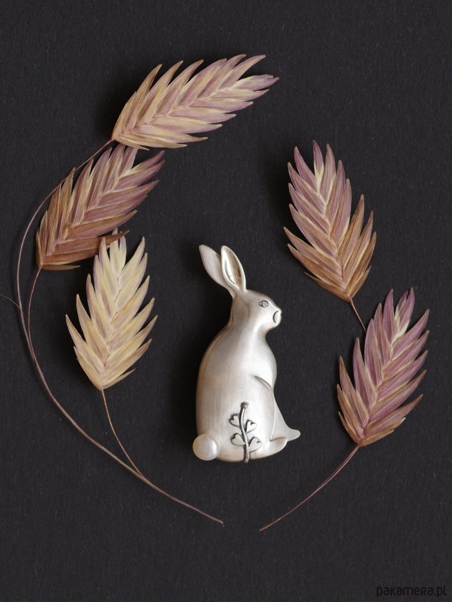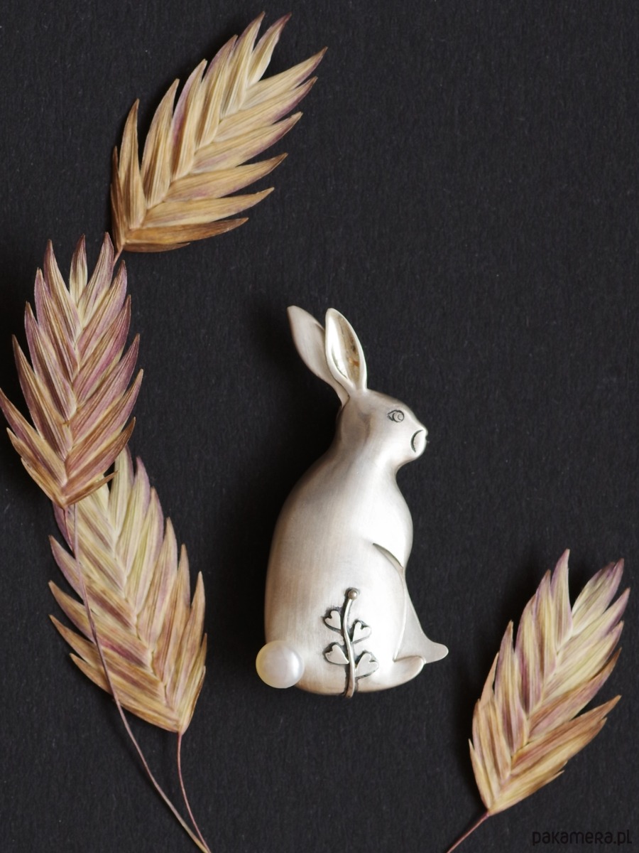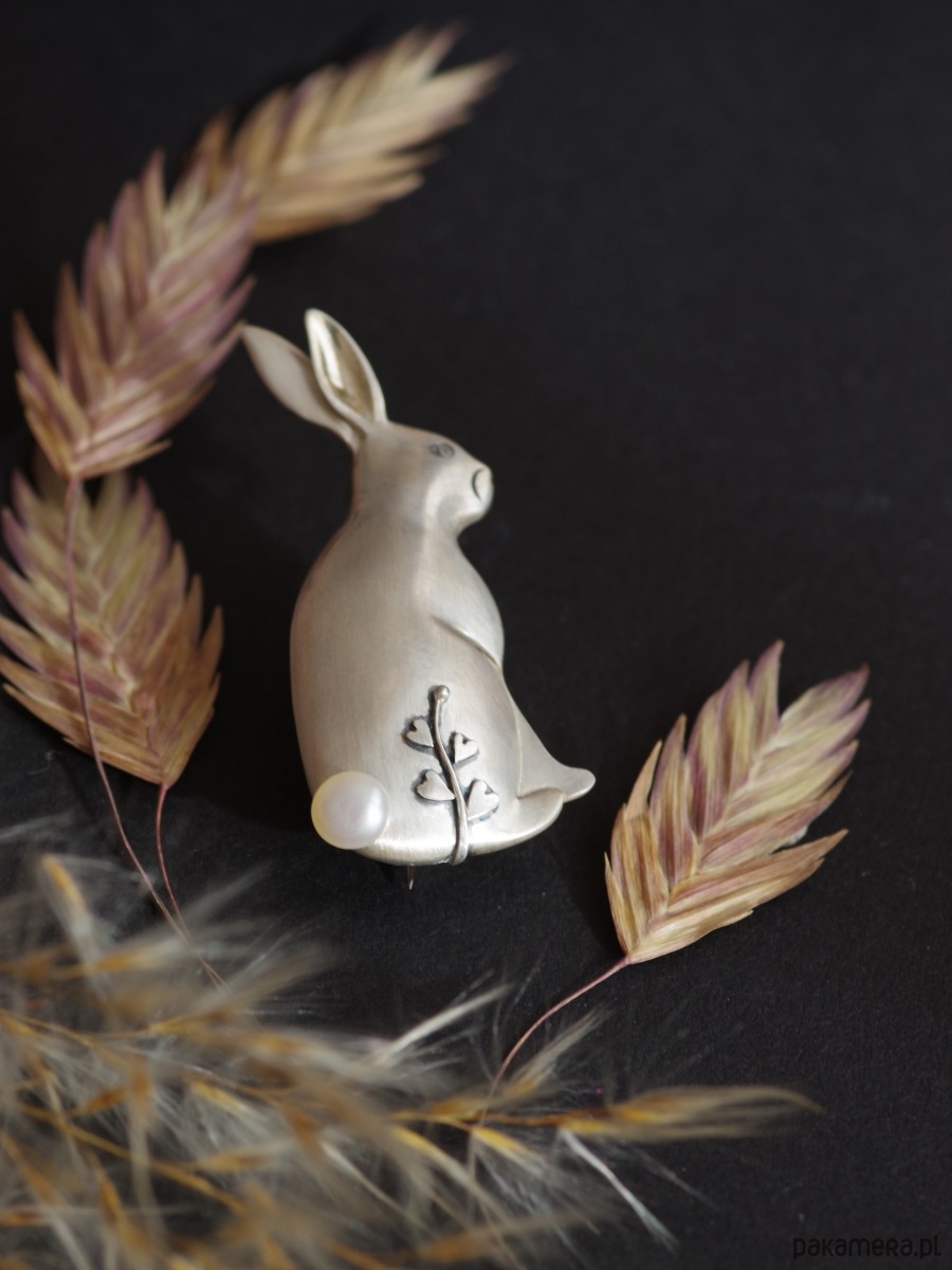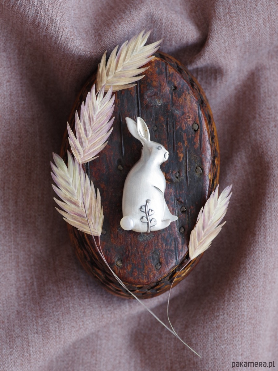 Satynowe wykończenie powierzchni, błyszczące wnętrze zajęczego ucha, maleńkie detale oka i pyszczka, roślinny motyw i perła w miejscu ogonka tworzą niezwykłą, uroczą i tajemniczą całość.