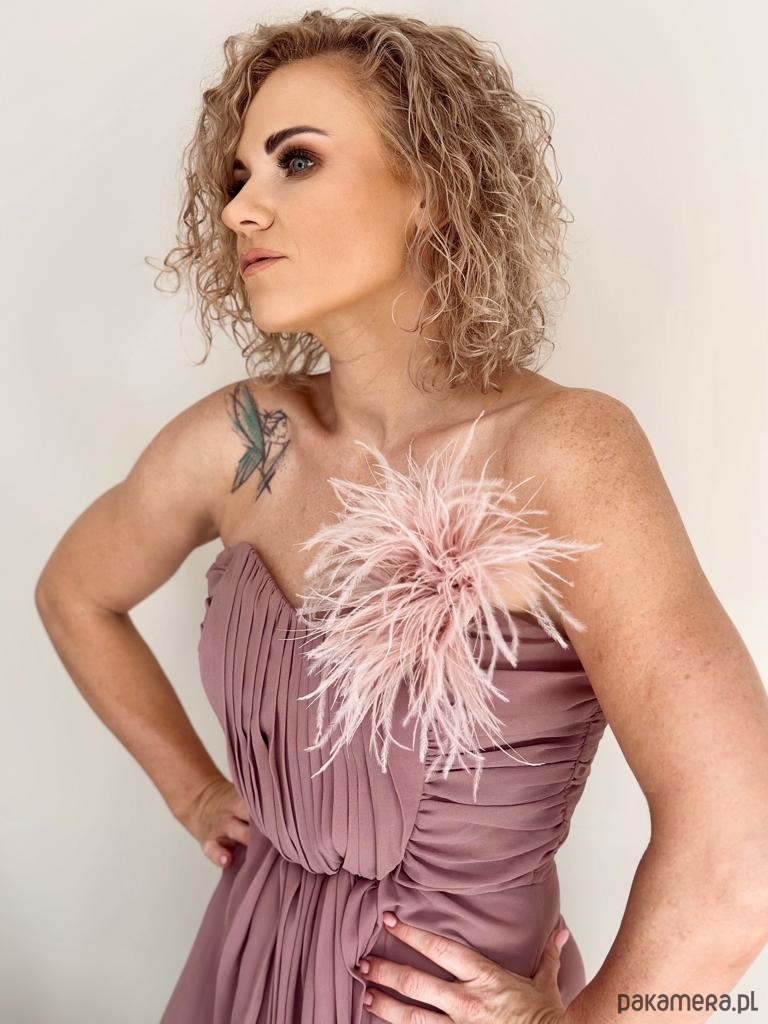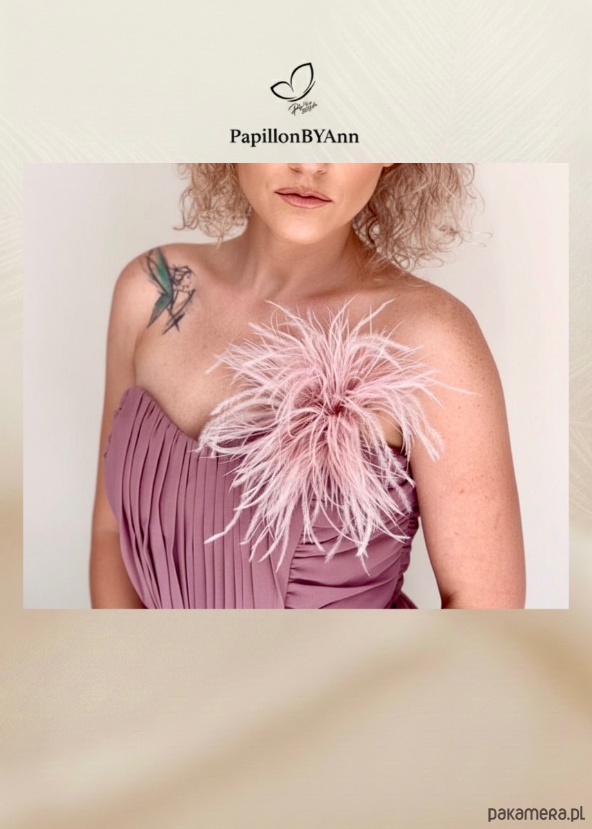 Ta broszka, pełniąca jednocześnie rolę fascynatora do włosów, została wykonana z delikatnych strusich piórek, dodając subtelnej nuty zmysłowości nawet najprostszym koszulom, marynarkom, sukienkom czy t-shirtom. Doskonała do podkreślenia wieczornego charakteru stroju lub odświeżenia codziennego looku. Jest niezwykle modnym dodatkiem, który pięknie faluje w ruchu