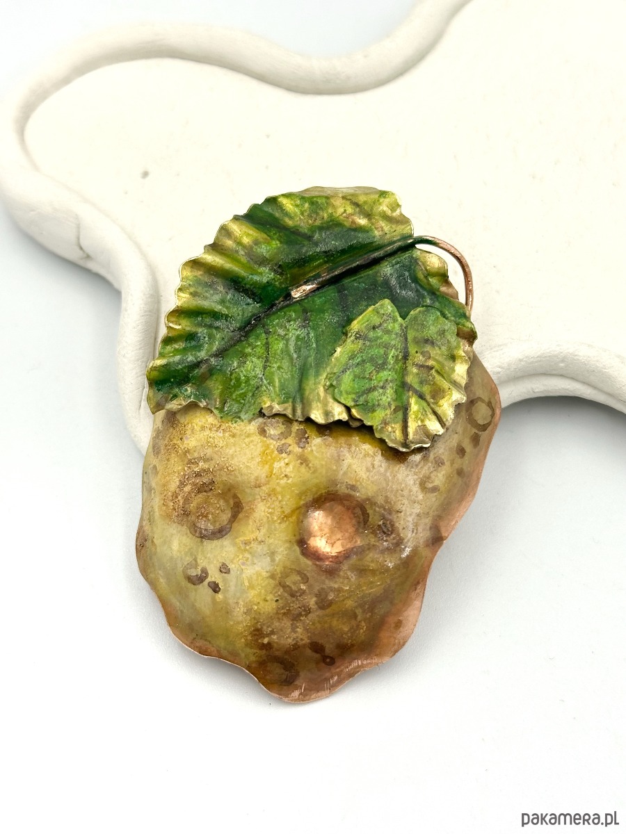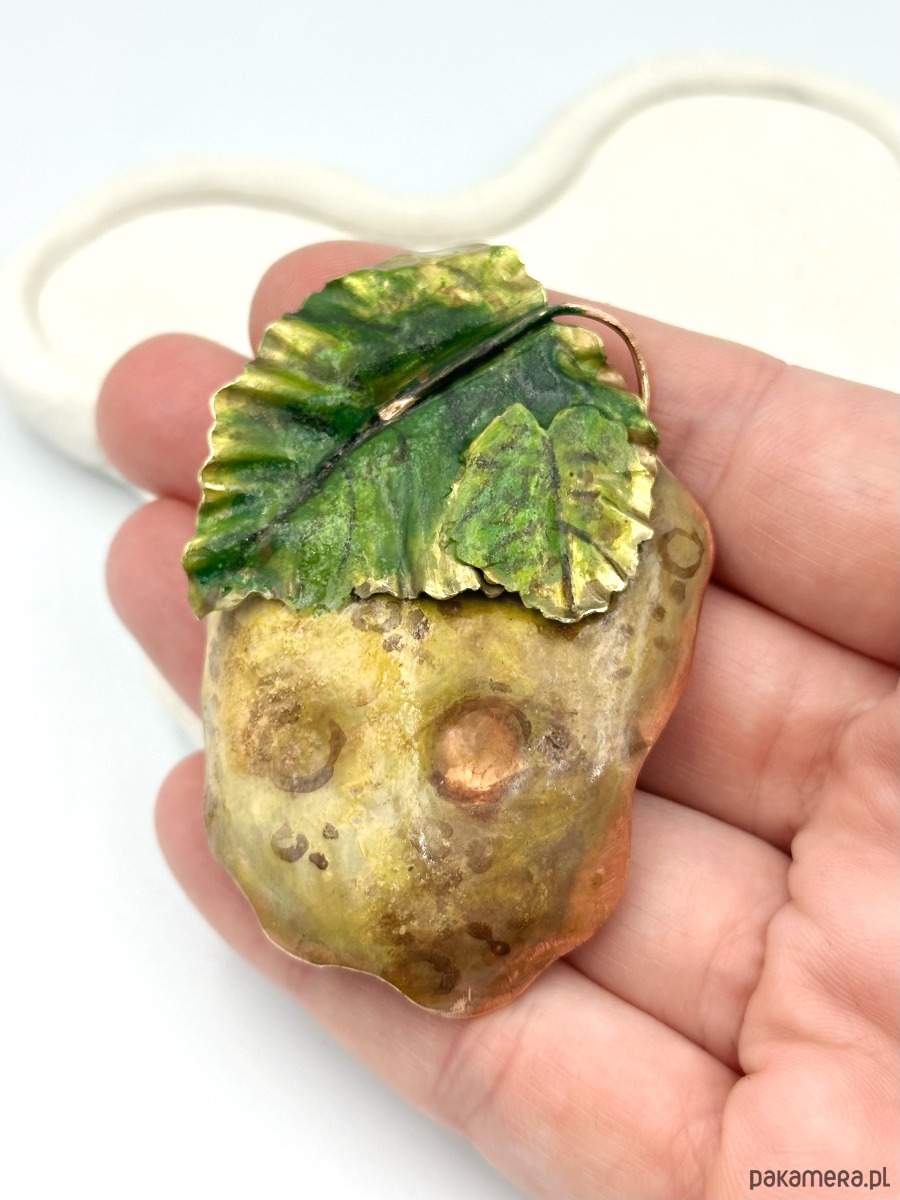 Broszka wykonana z miedzi. Projekt autorski. Broszka malowana akrylem a następnie utrwalana werniksem.