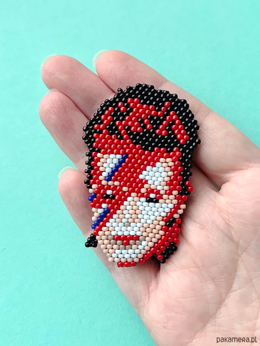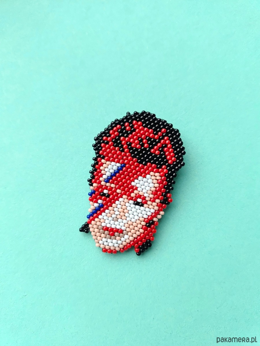 Portret Davida Bowiego w kultowym wcieleniu Ziggy’ego Stardusta. Broszka została wykonana ręcznie w technice brick stitch, z drobnych, kolorowych koralików. Wzór jest mojego autorstwa — inspirowany jednym z najbardziej rozpoznawalnych momentów w karierze artysty.
