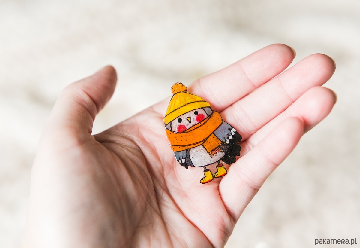 Urocza broszka z zimowym wróbelkiem, narysowanym w słodkim, delikatnym stylu. Idealny mały akcent na kurtkę lub sweter.