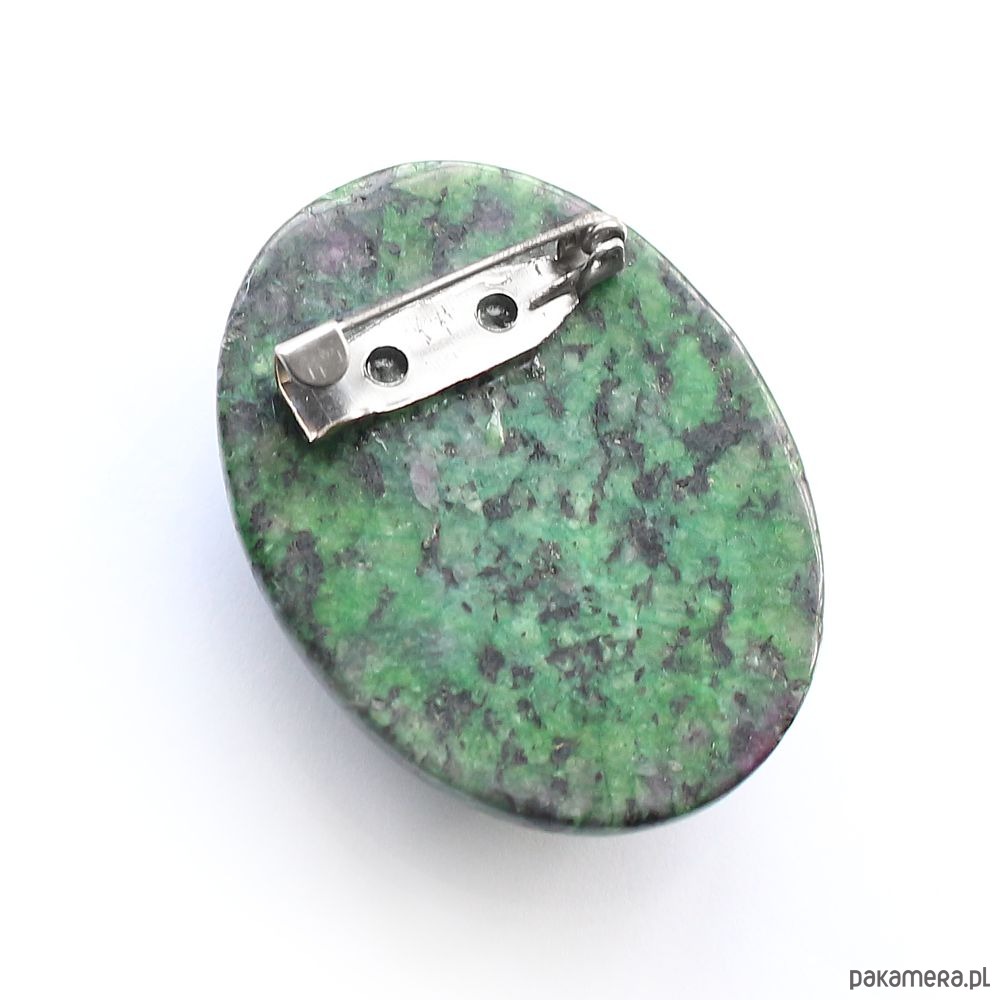 Ręcznie wykonana broszka kaboszonowa z zoisytem i rubinem. Stylowy dodatek do garderoby lub wnętrza!