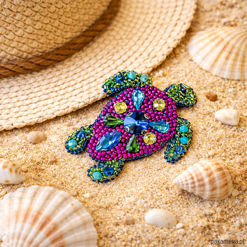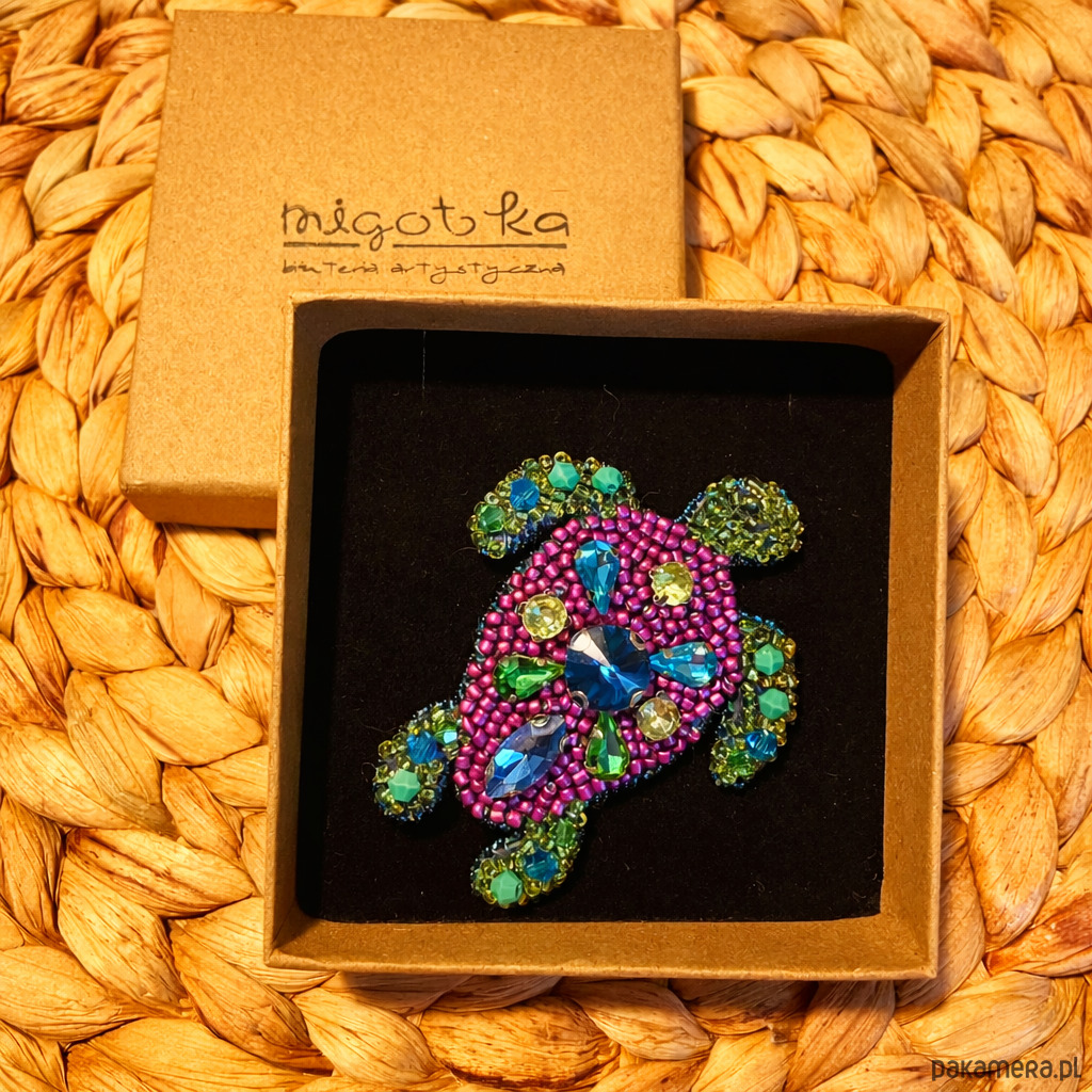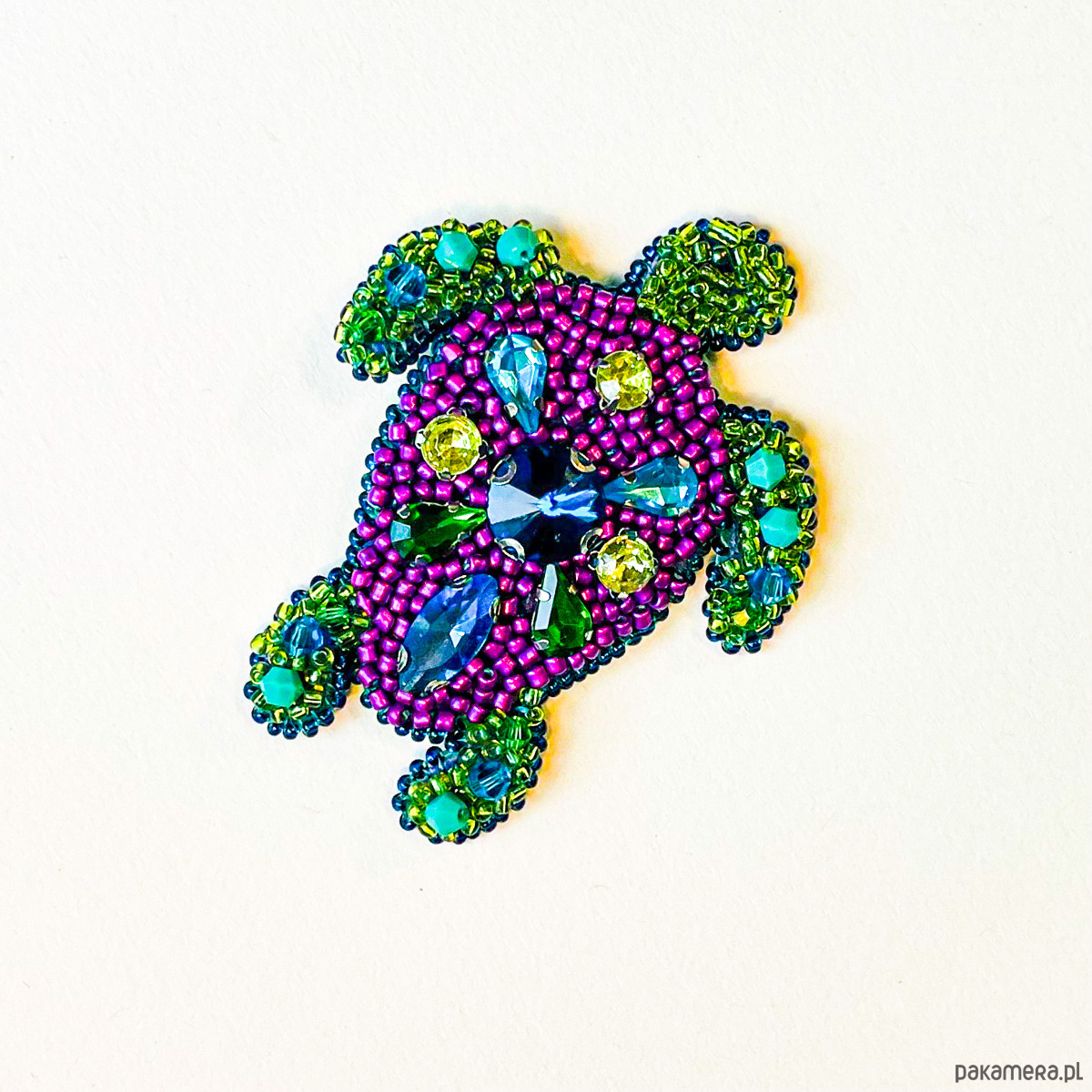 Ta wyjątkowa broszka w kształcie żółwia to małe dzieło sztuki – ręcznie zdobiona koralikami i kryształkami, które pięknie odbijają światło.