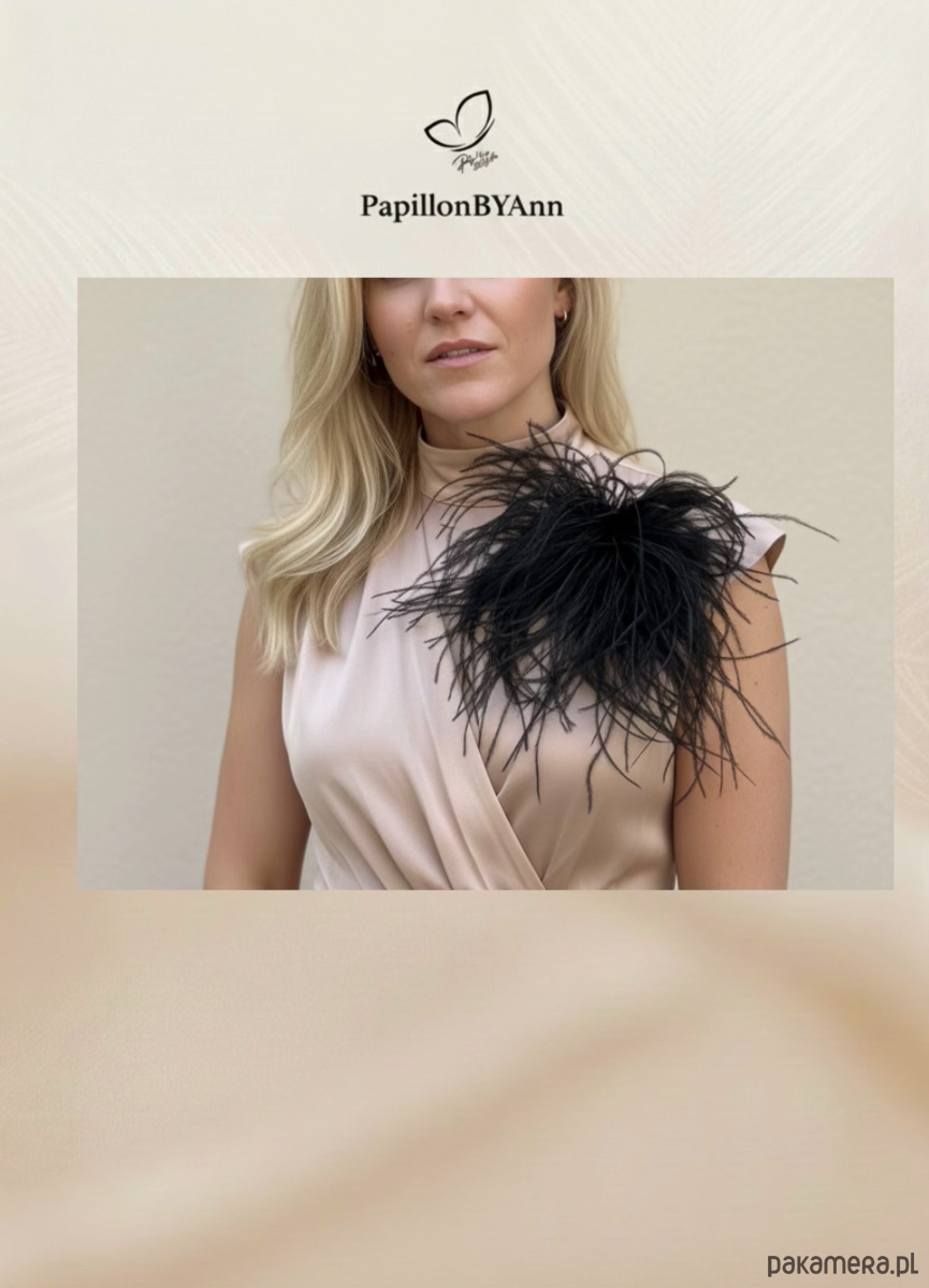 Ta broszka, jednocześnie fascynator do włosów, wykonana jest z delikatnych strusich piórek, które sprawią, że nawet najprostsza koszula, marynarka, sukienka czy t-shirt nabiorą stylowego charakteru z nutą zmysłowości. Doskonała do podkreślenia wieczorowego charakteru ubrania lub dla odświeżenia codziennego looku. To niezwykle modny dodatek, który pięknie faluje w ruchu. Nie wahaj się eksperymentować z dodatkami i nos ją śmiało każdego dnia!