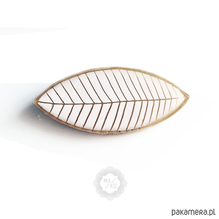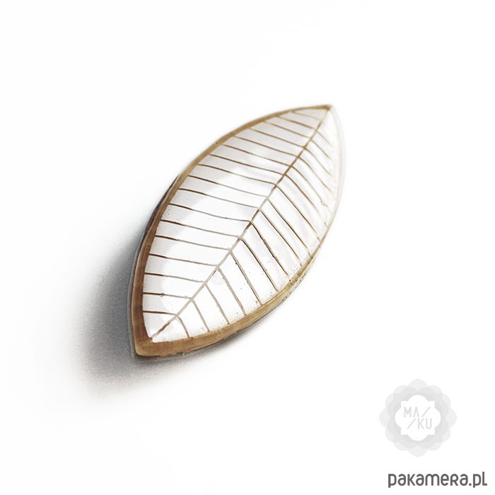 Urokliwa broszka ze szkła w kształcie piórka, wykonana metodą fusingu. Piękne żywe kolory i ładny, graficzny, ręcznie malowany wzór na powierzchni. Może stanowić ciekawy dodatek do torby, płaszcza czy sukienki. Biżuteria wykonana ręcznie, każdy egzemplarz może minimalnie różnić się od zdjęcia. Wymiary: 3x7 cm