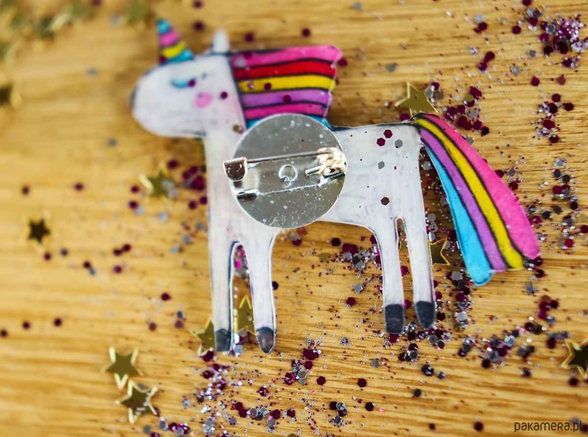 Piękna broszka ręcznie rysowana, zabezpieczona lakierem ekologicznym. Powierzchnia broszki jest błyszcząca.