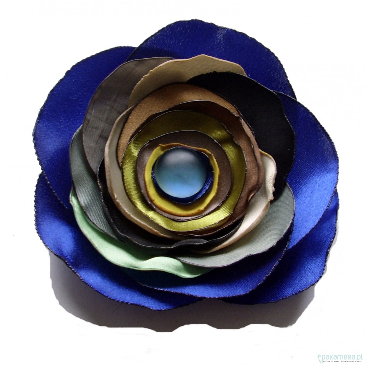 Lekka broszka została wykonana ręcznie ; jej płatki są zabezpieczone przed strzępieniem, środek ozdobiony szklanym oczkiem w metalowej oprawce. Z tyłu wszyto zabezpieczone zapięcie broszkowe o długości 30mm. Rozpiętość całkowita - około 11,5cm. Przedmiot wysyłam zabezpieczony przed zgnieceniem w transporcie. __________________ Forma broszki jest chroniona prawem autorskim!