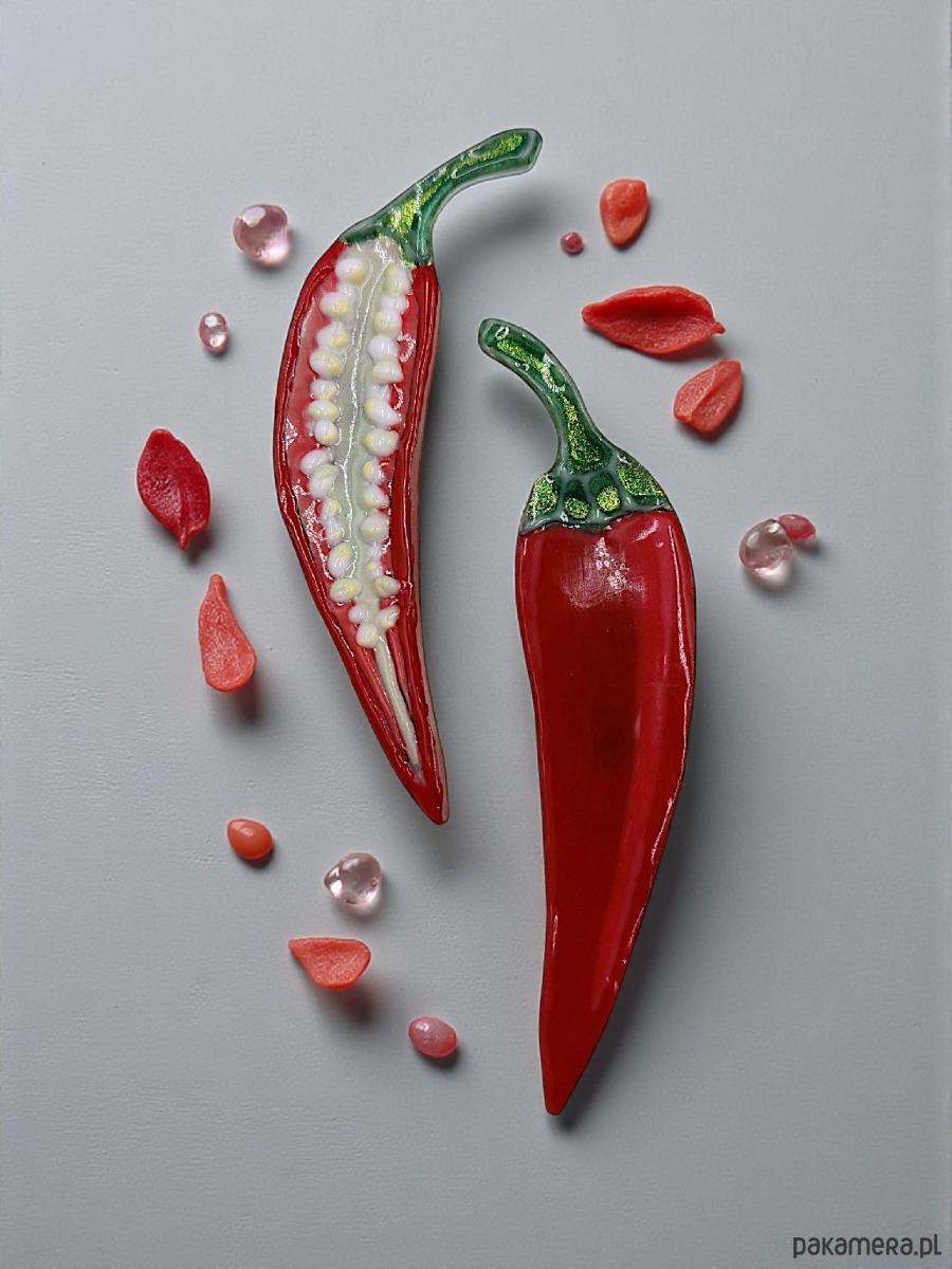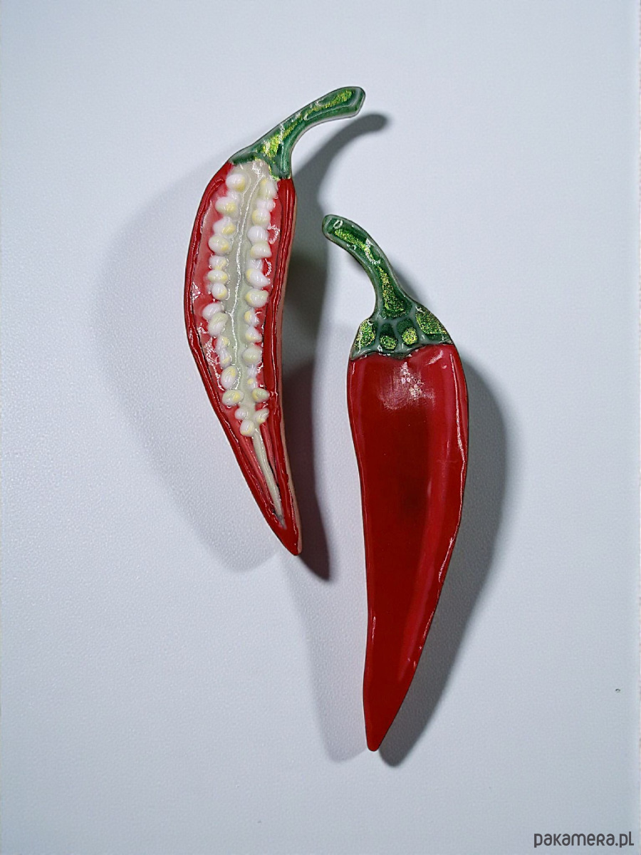 Zestaw dwóch broszek PERI w kształcie czerwonej papryki — idealny dodatek dla osób ceniących sobie oryginalność i odrobinę pikanterii w stylu.Każda broszka została wykonana ze szkła polimerowego, a następnie ręcznie malowana żywicą UV, co nadaje jej wyjątkowy połysk i głębię koloru. Detale, takie jak nasiona i struktura wnętrza papryki, zostały odwzorowane z niezwykłą precyzją, tworząc efekt realistycznej miniatury.