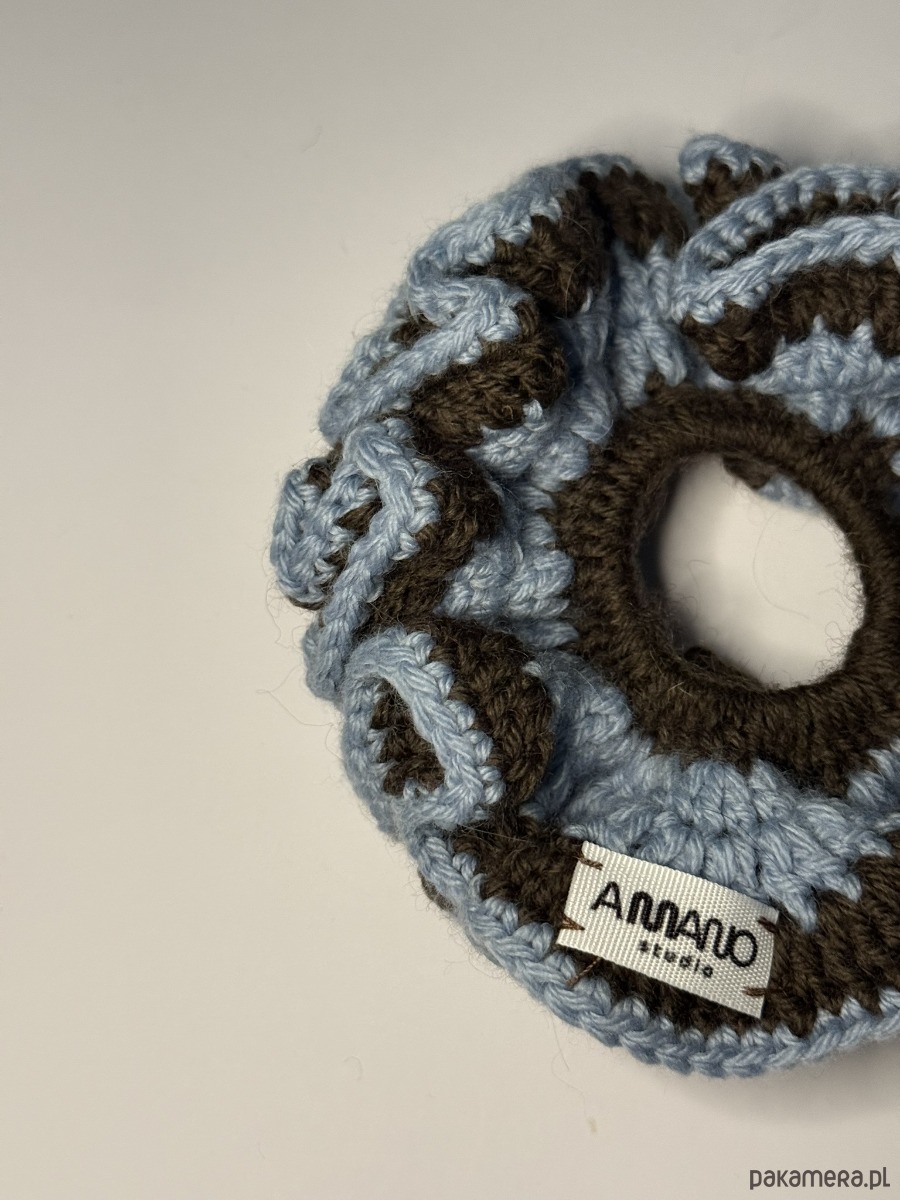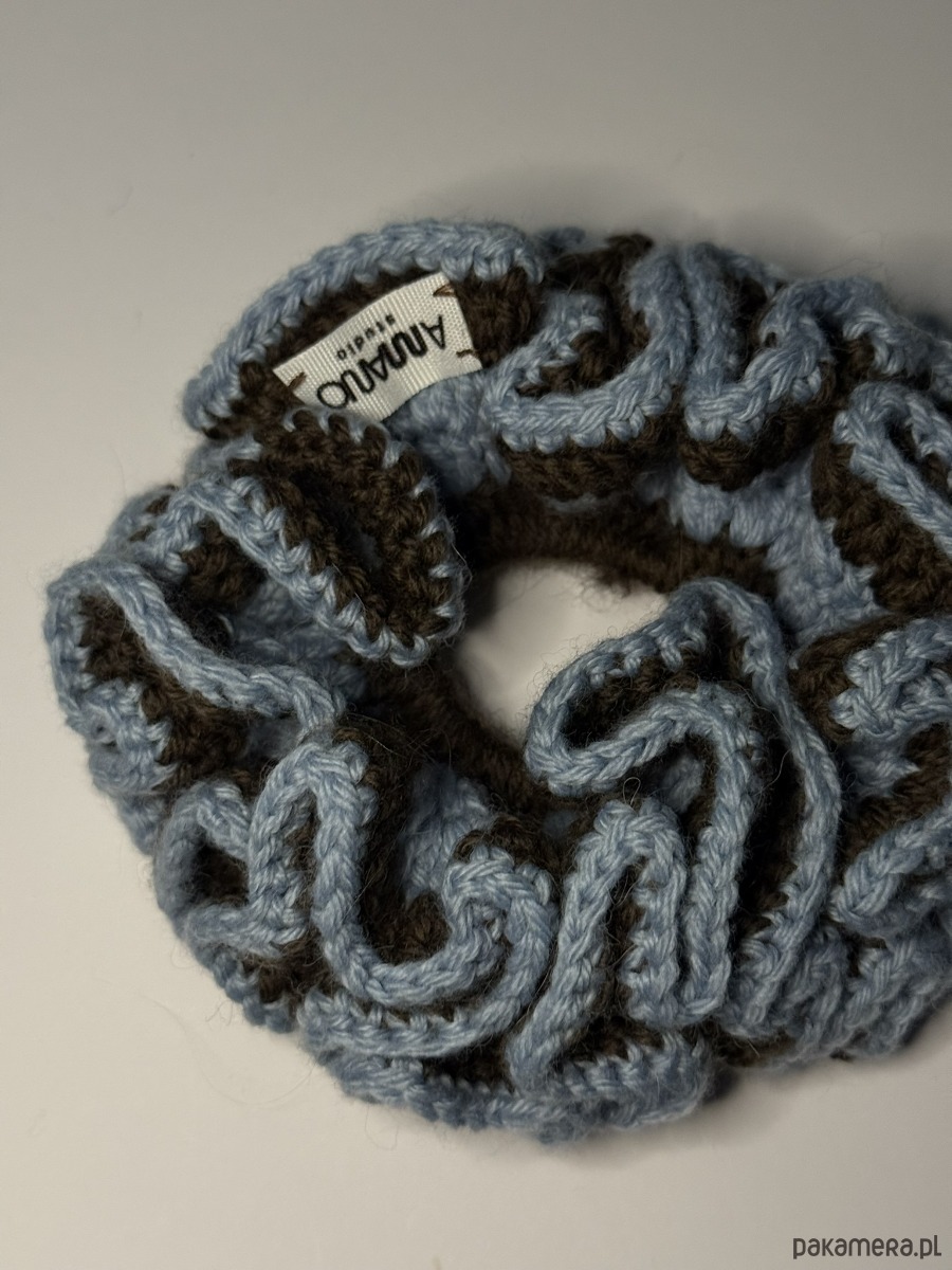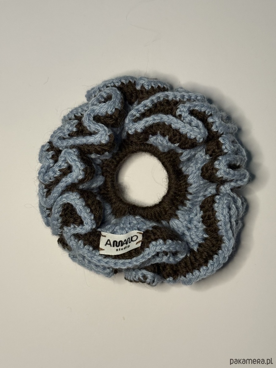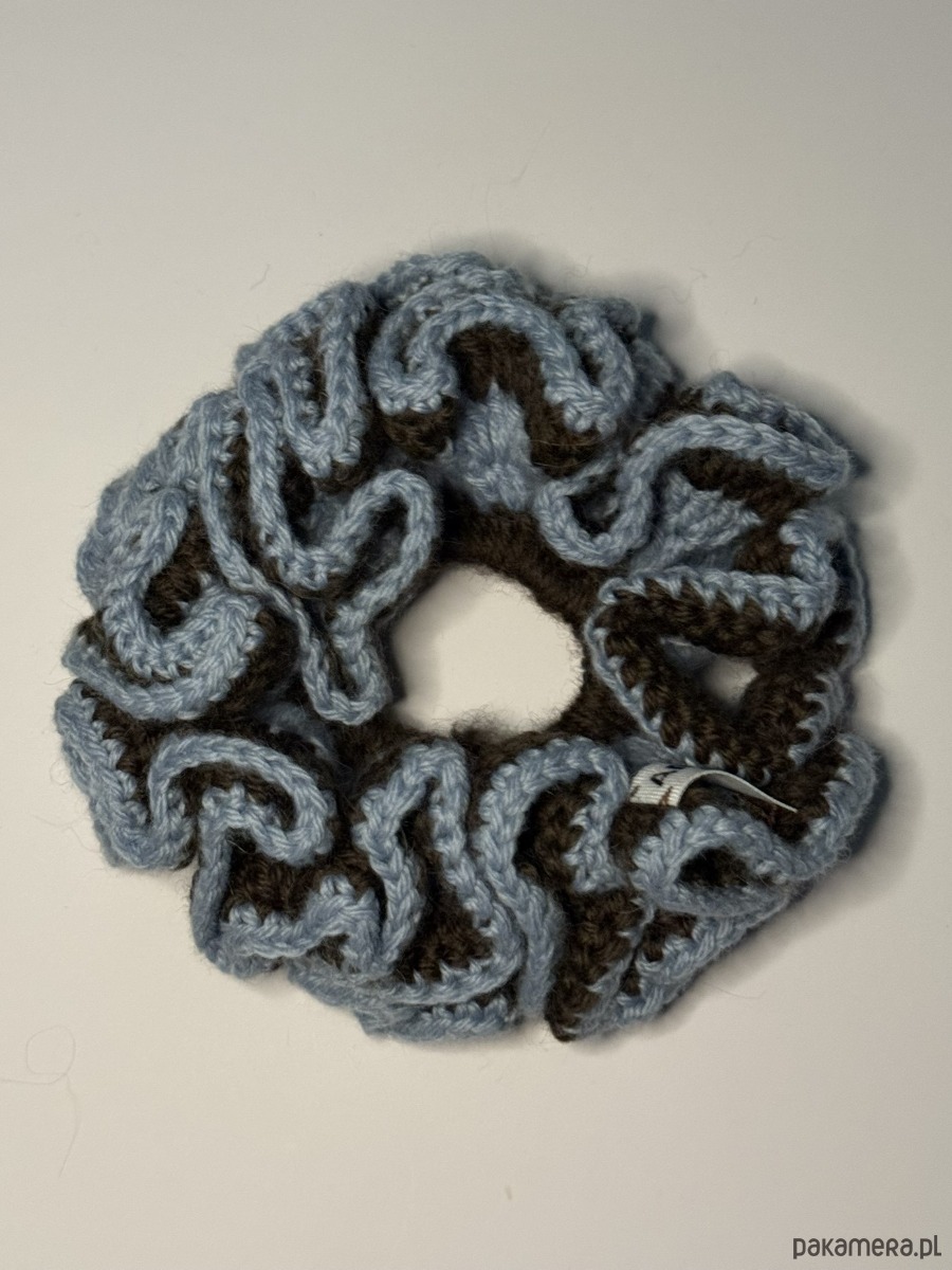 Gumka do włosów wykonana na szydełku z dwóch kolorów włóczki - brązowej i niebieskiej. Skład włóczki brązowej to 100% czysta wełna, a niebieskiej to 70% wełna merynosa oraz 30% alpaka.
