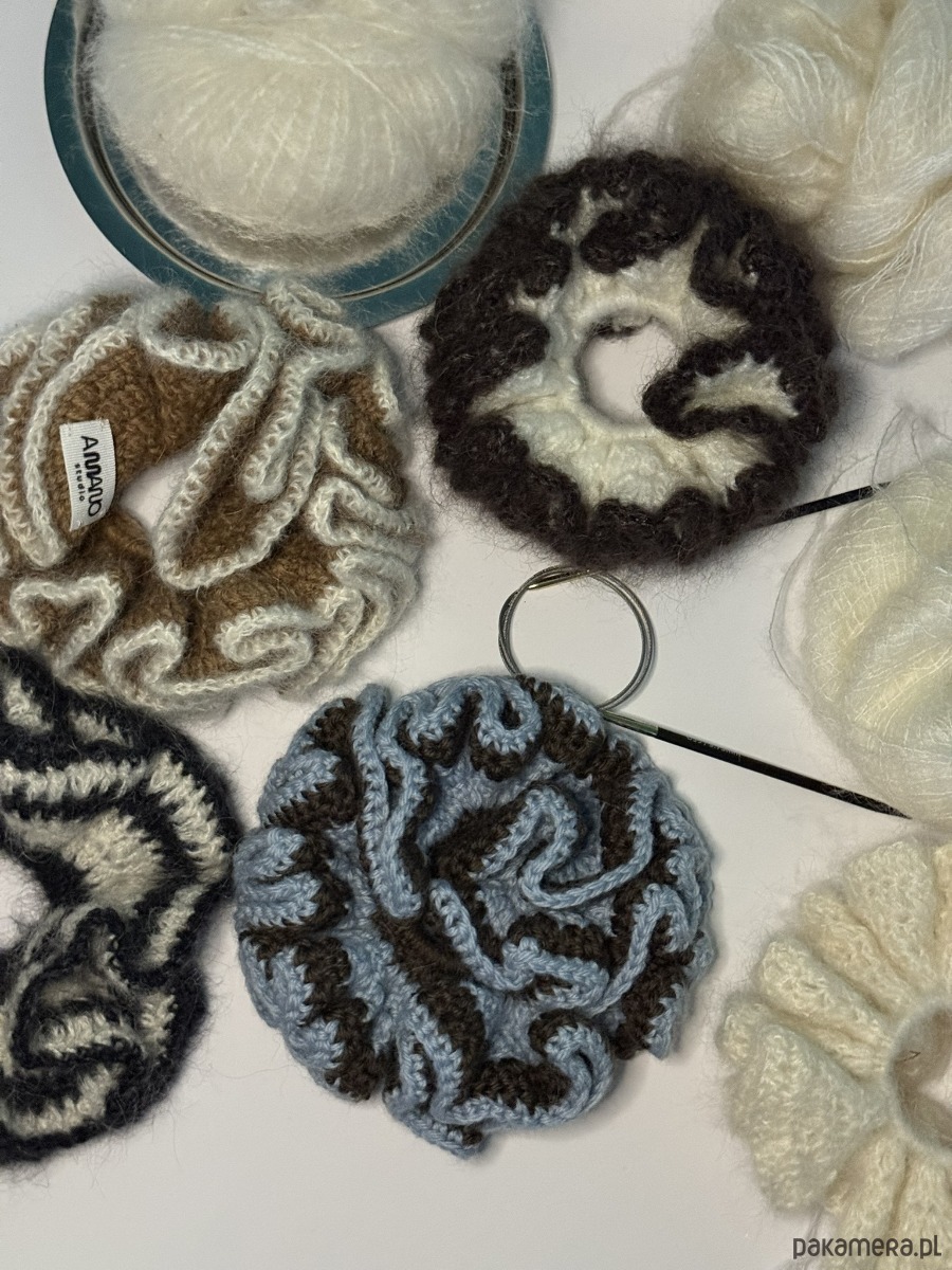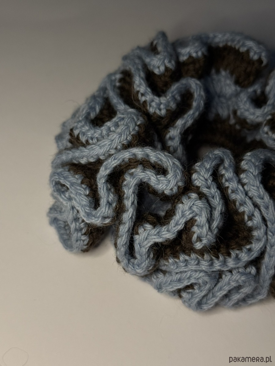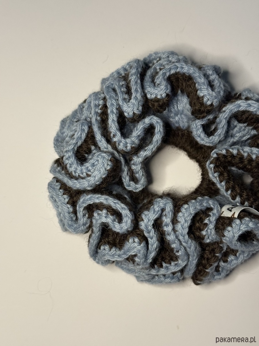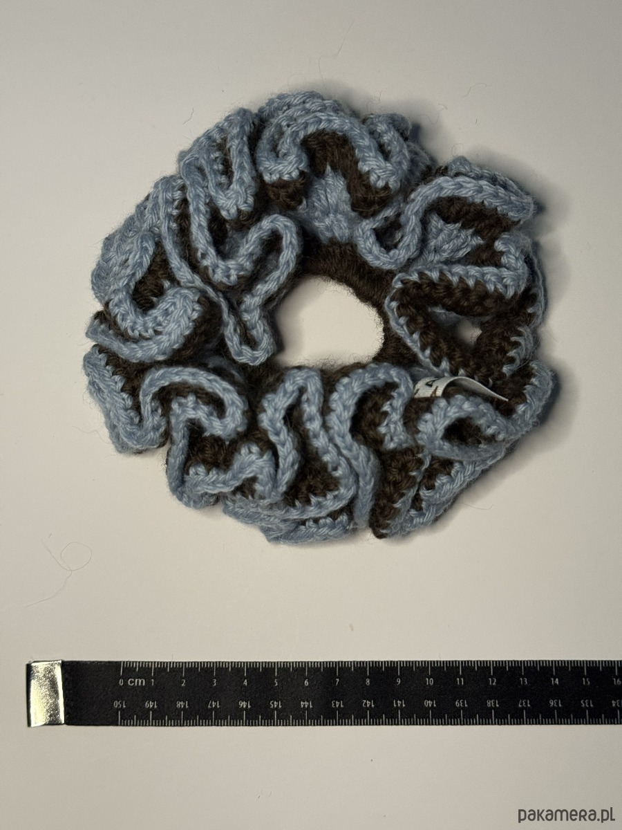 Gumka do włosów wykonana na szydełku z dwóch kolorów włóczki - brązowej i niebieskiej. Skład włóczki brązowej to 100% czysta wełna, a niebieskiej to 70% wełna merynosa oraz 30% alpaka.