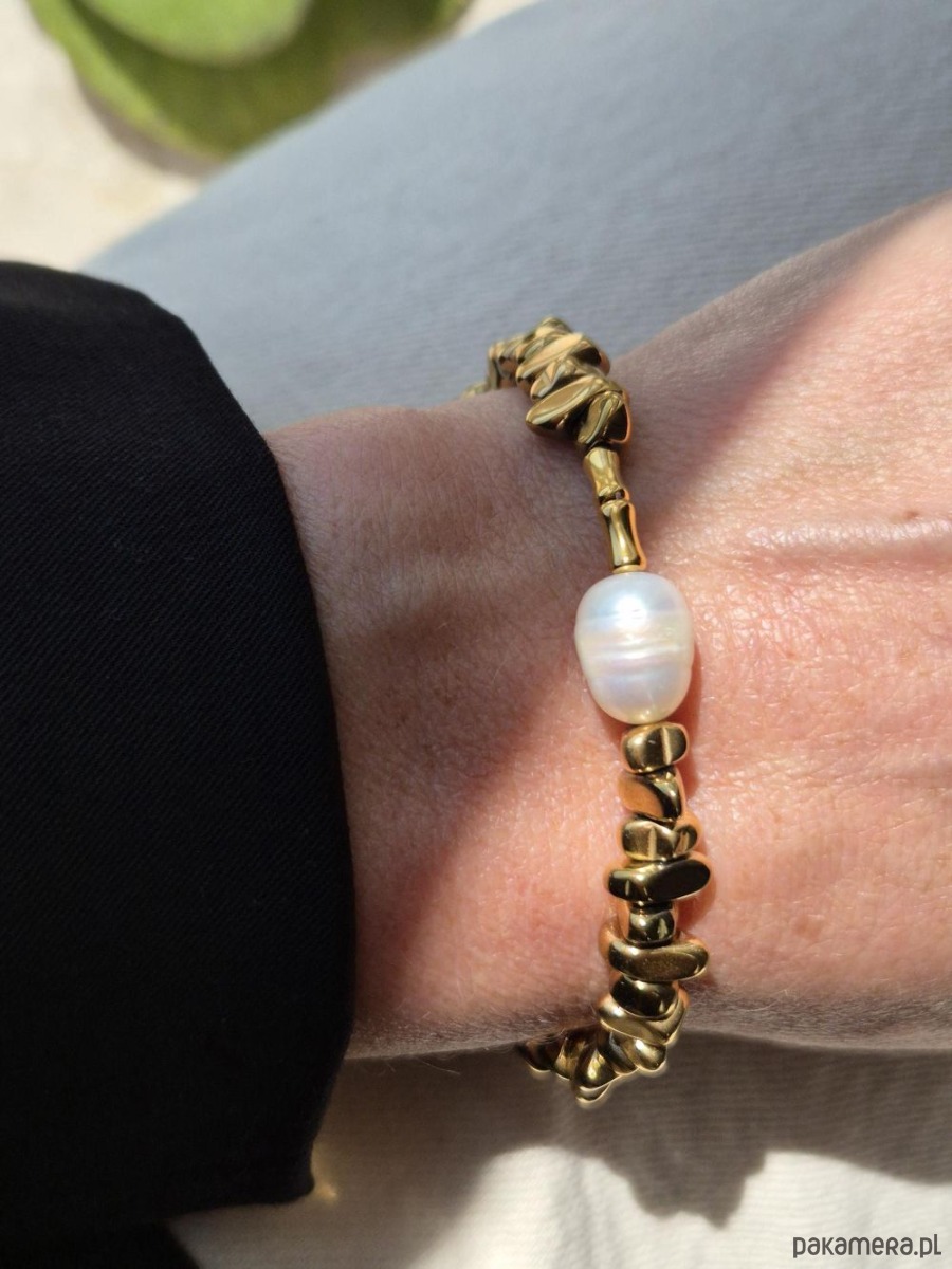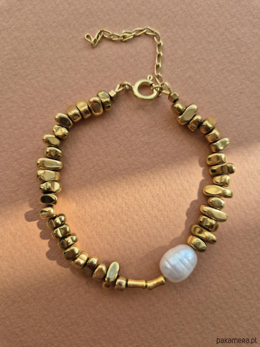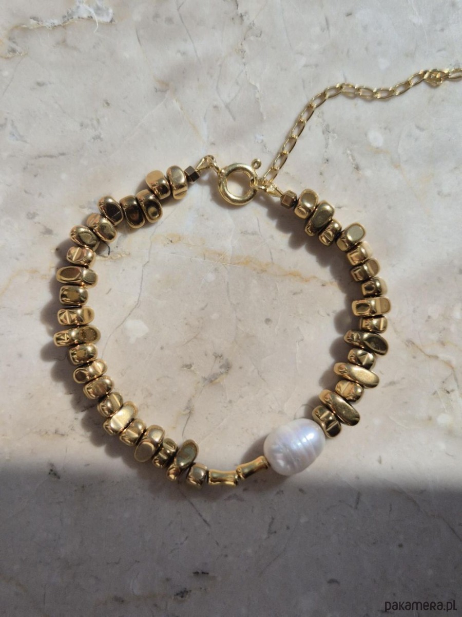 Bransoletka wykonana ręcznie z pozłacanych hematytów w kształcie nieregularnych kropel, ozdobiona dużą perłą naturalną. Lekkości dodaje jej łańcuszek. Duża, bogato zdobiona bransoletka sprawdzi się jako dodatek do prostych eleganckich stylizacji, najlepiej jedno lub dwukolorowych. Oryginalny wzór bransoletki nie przejdzie nie zauważony. W innej ofercie naszyjnik do kompletu (na ostatnim zdjęciu).
