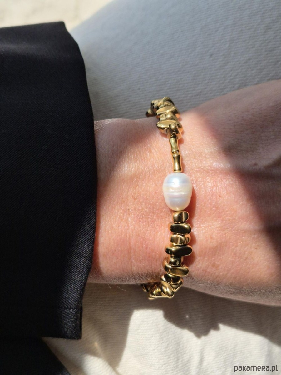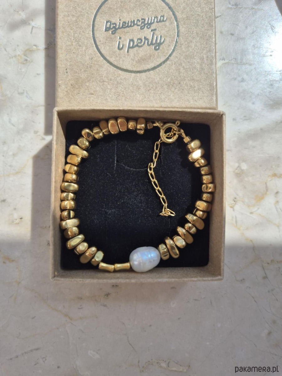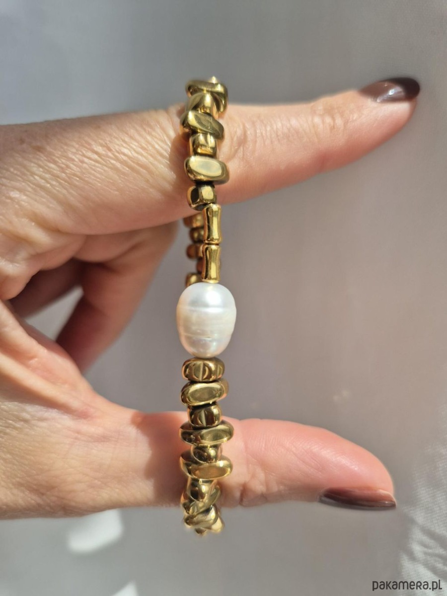 Bransoletka wykonana ręcznie z pozłacanych hematytów w kształcie nieregularnych kropel, ozdobiona dużą perłą naturalną. Lekkości dodaje jej łańcuszek. Duża, bogato zdobiona bransoletka sprawdzi się jako dodatek do prostych eleganckich stylizacji, najlepiej jedno lub dwukolorowych. Oryginalny wzór bransoletki nie przejdzie nie zauważony. W innej ofercie naszyjnik do kompletu (na ostatnim zdjęciu).