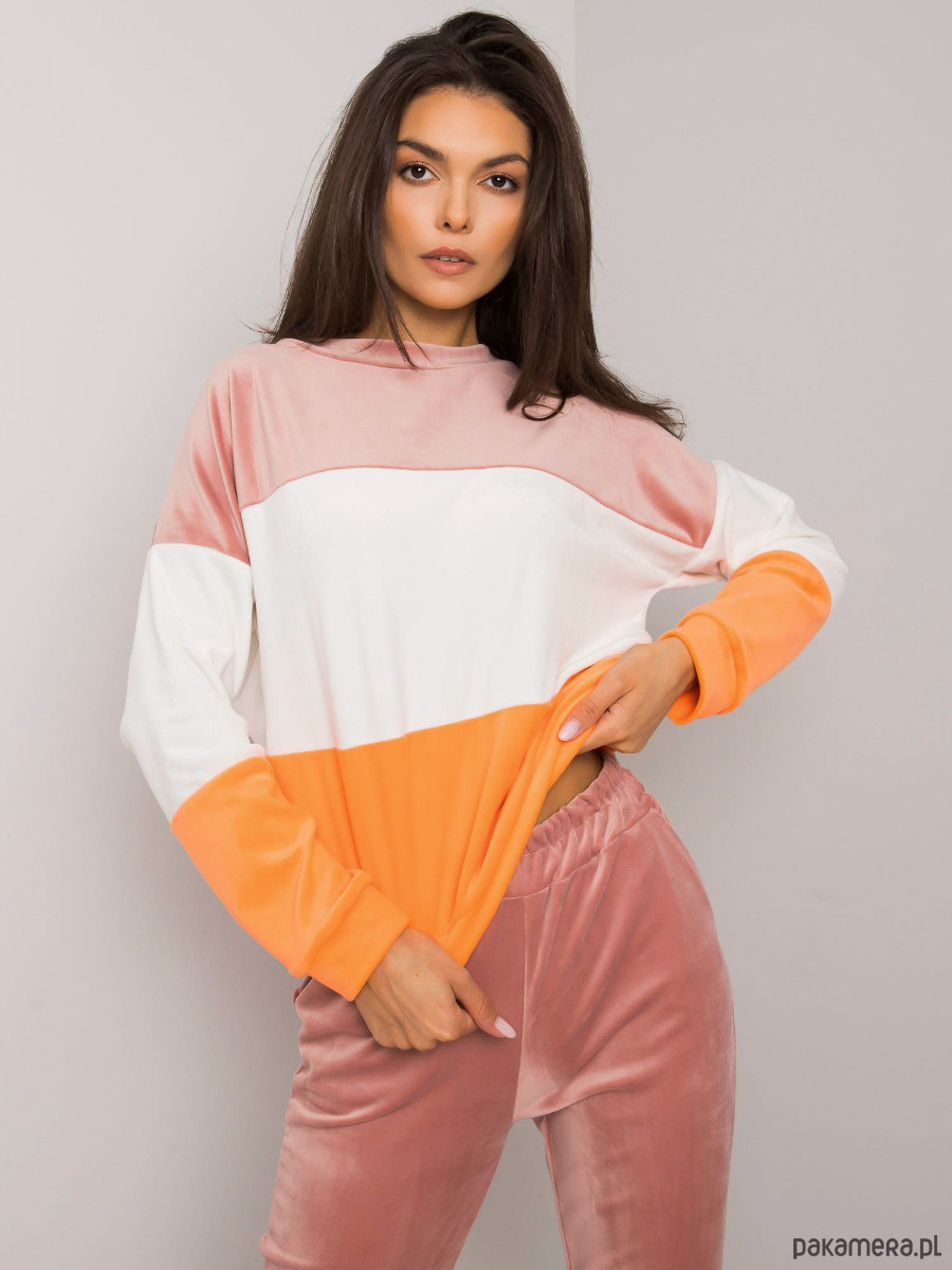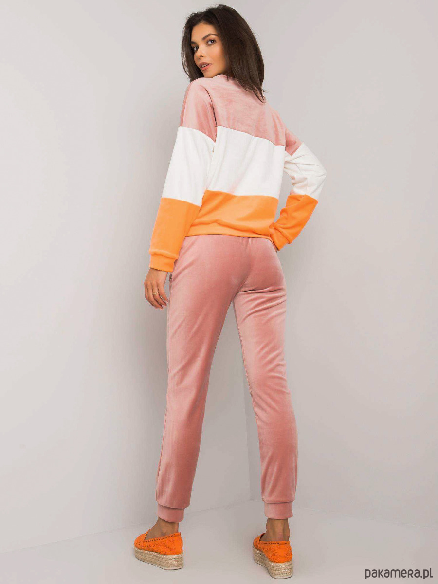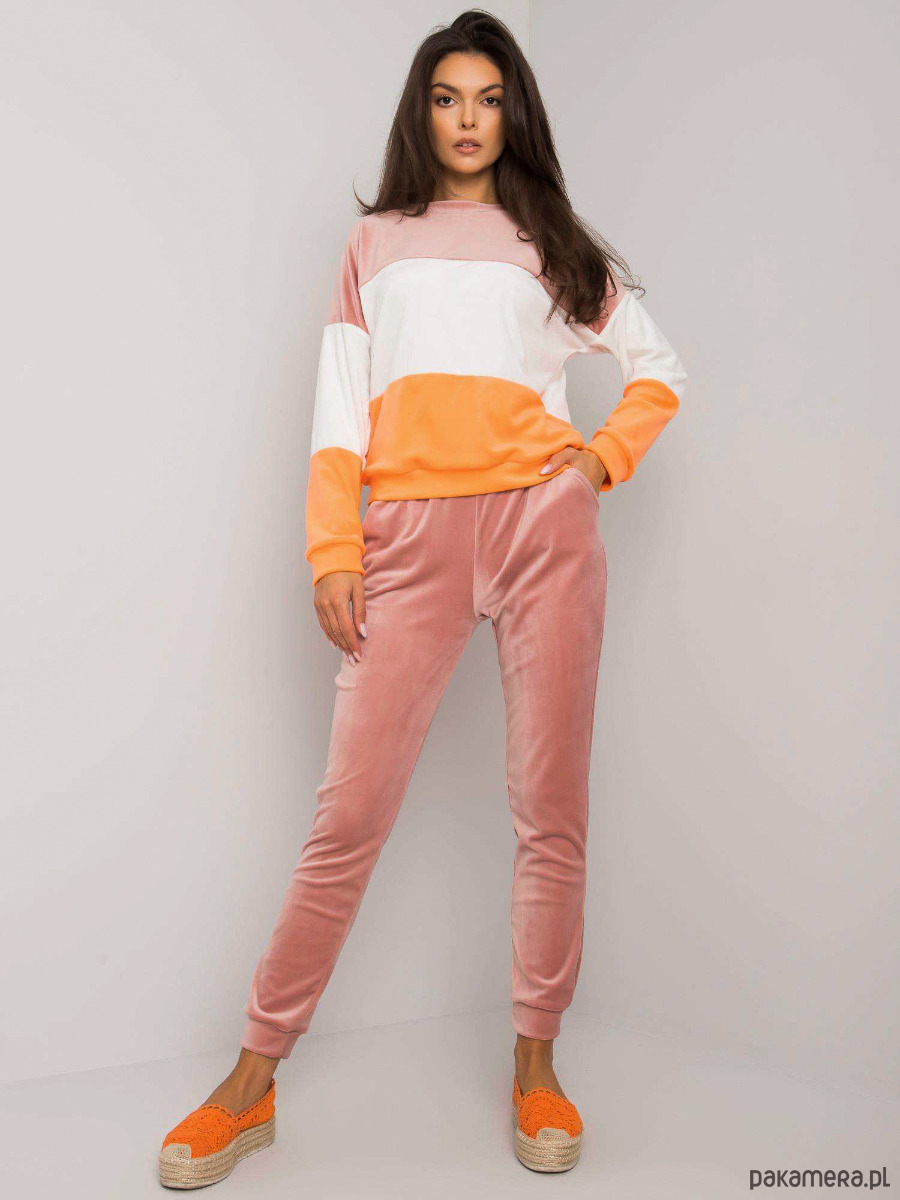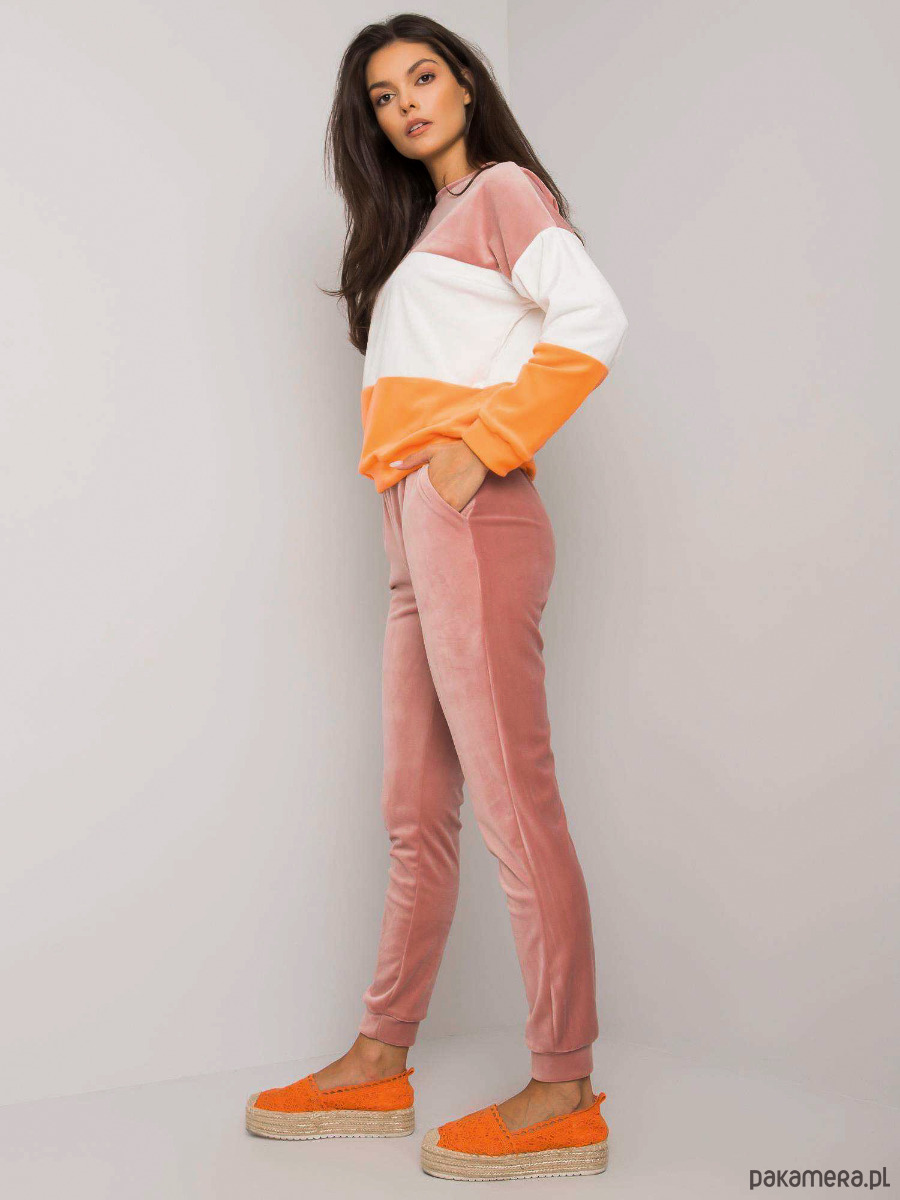 Welurowy komplet dresowy damski Andrine. Posiada bluzę bez kaptura oraz gumkę w pasie, dzięki czemu idealnie dopasowuje się do sylwetki. Komplet będzie świetną propozycją dla kobiet ceniących sobie komfort, ale jednocześnie chcących wyglądać stylowo.