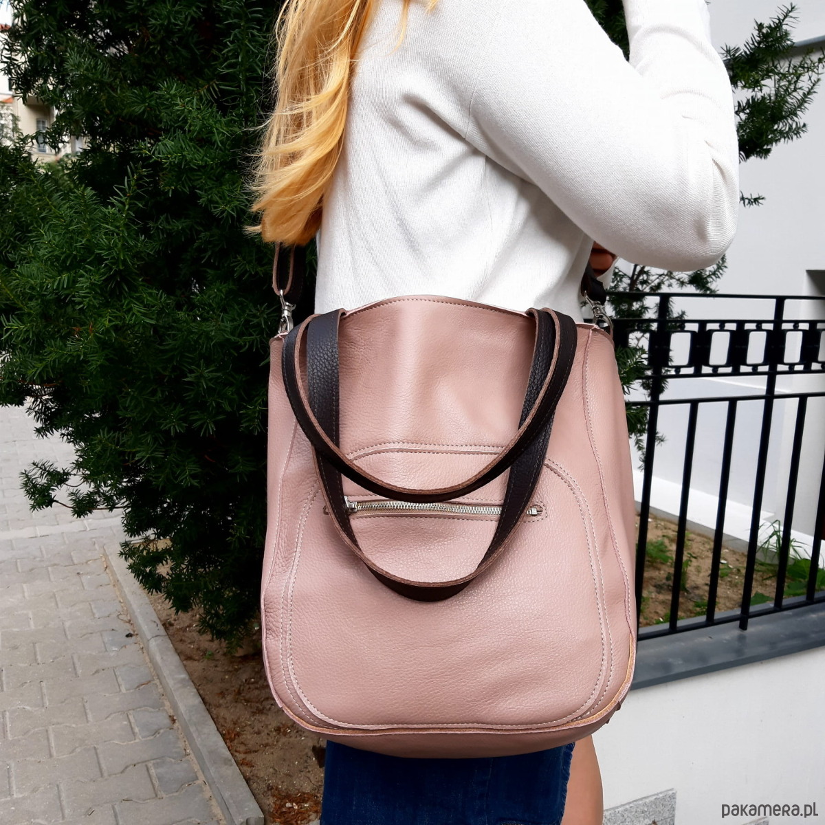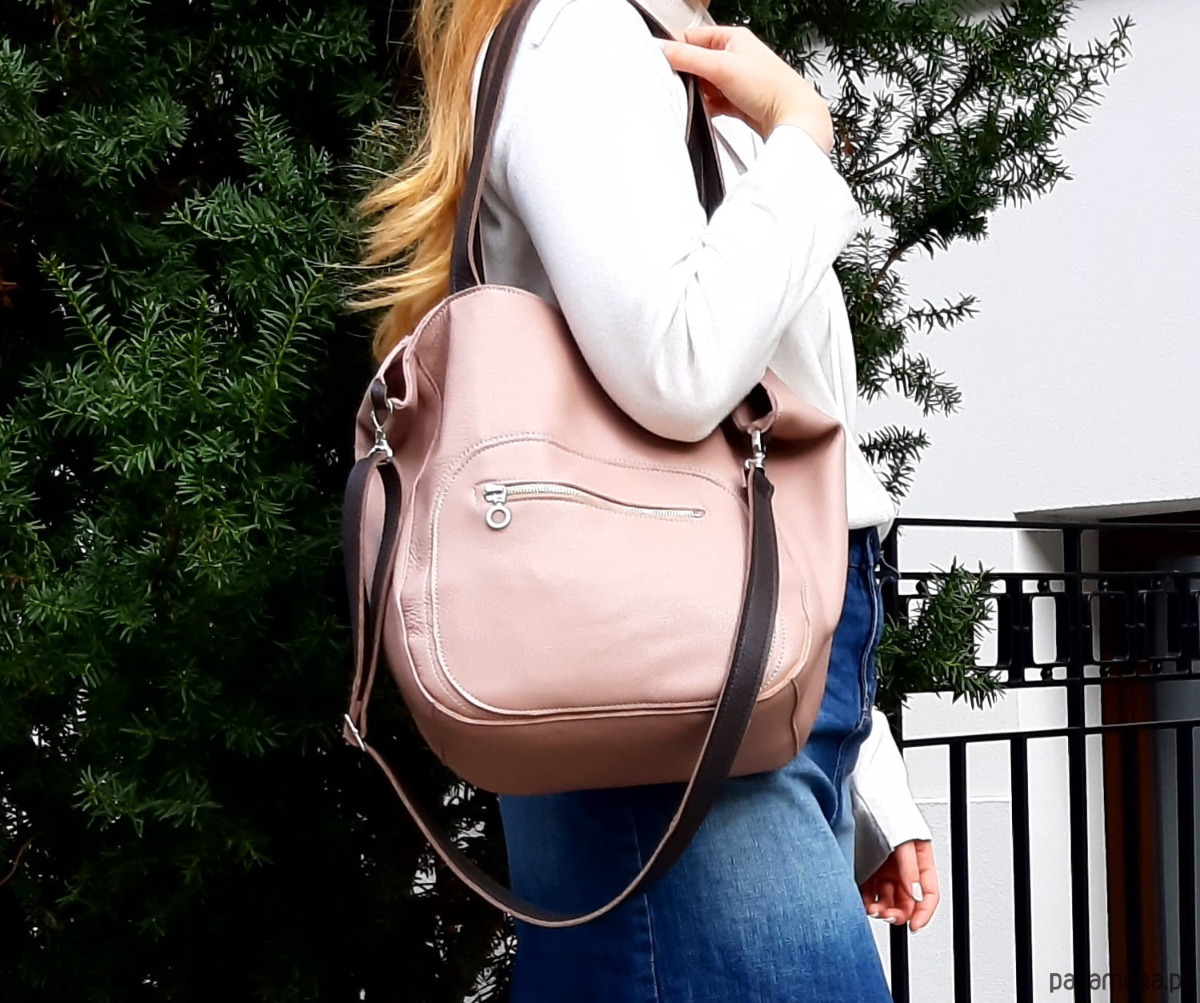 Brudno różowa skórzana torebka. Uszyta z prawdziwej, miękkiej skóry naturalnej. Dla podkręcenia koloru - uchwyty w kolorze gorzkiej czekolady, również skórzane. Kolor w rzeczywistości trochę ciemniejszy niż na zdjęciu.