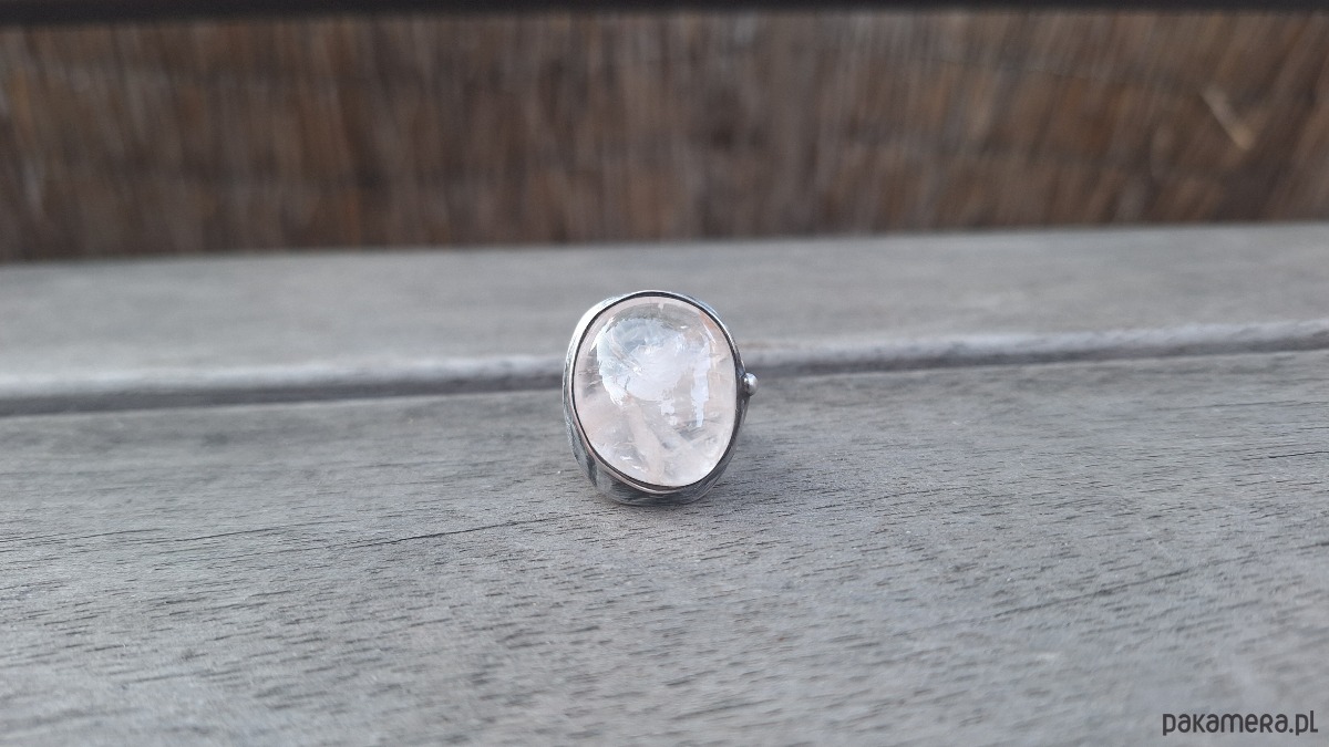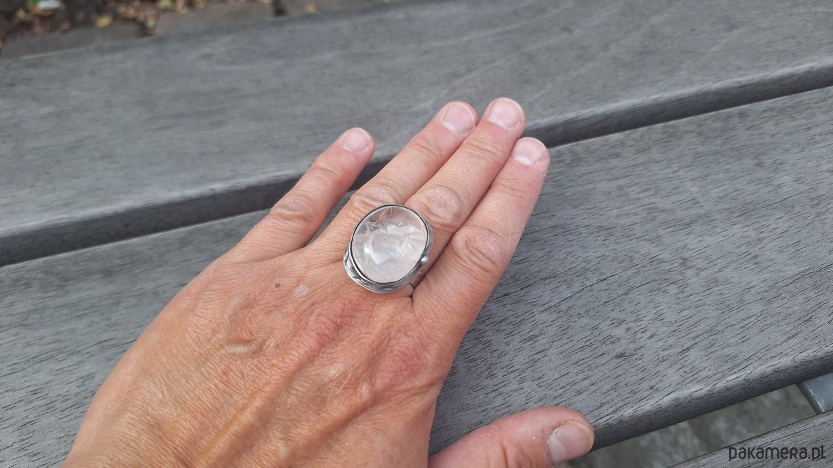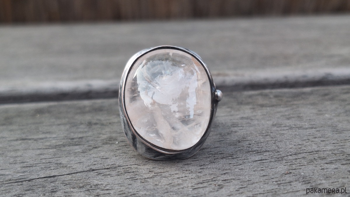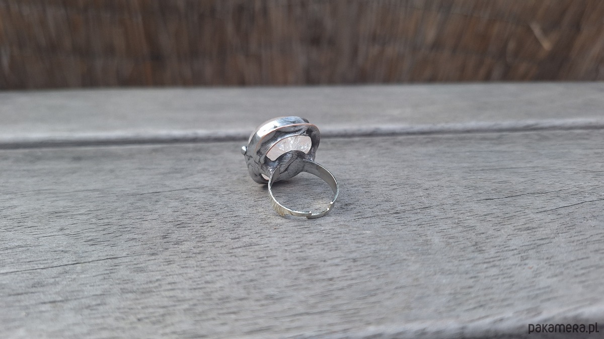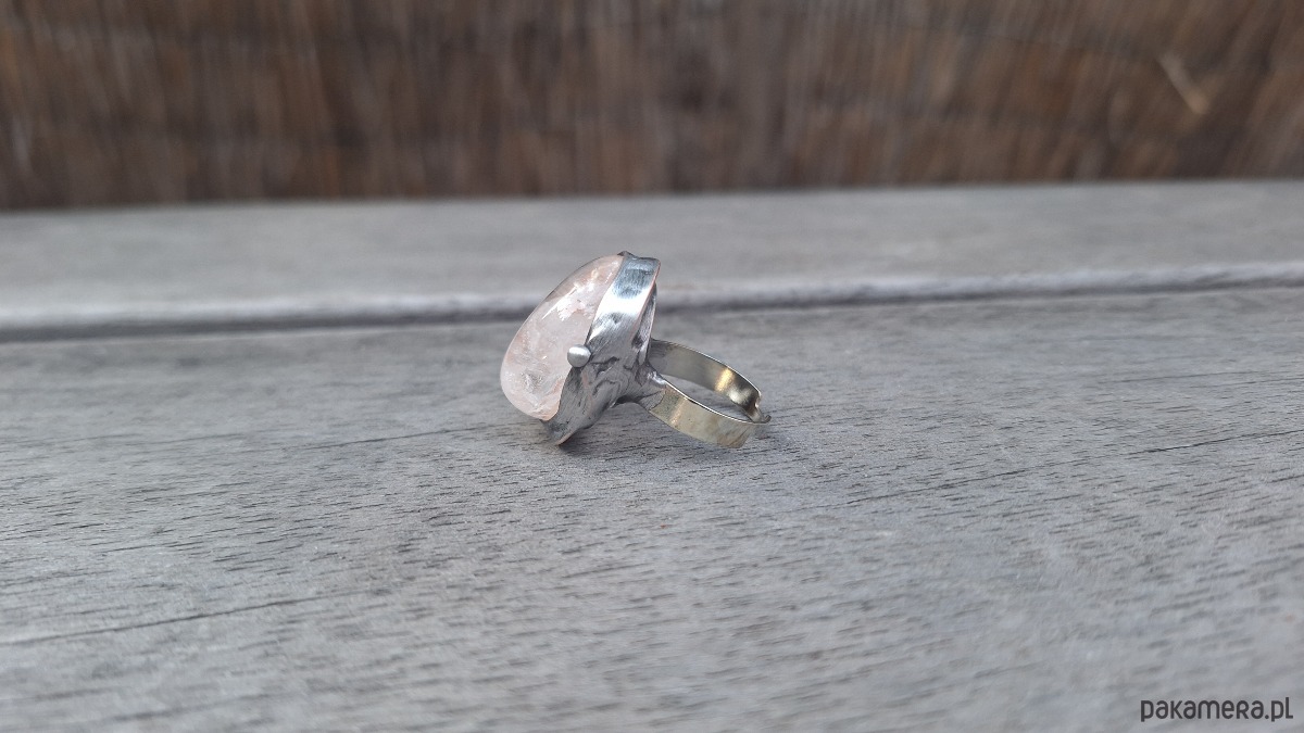 Pierścionek wykonany z miedzi, cyny i kryształu górskiego. Wymiary ok. 2.5 na 2 cm. Regulowany. Nie jest ciężki.