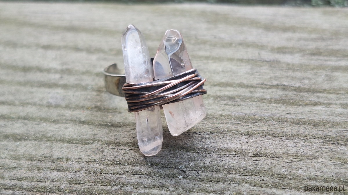 Pierścionek wykonany z miedzi, cyny i kryształu górskiego. Wymiary ok. 2.5 na 1.5 cm. Regulowany. Nie jest ciężki.