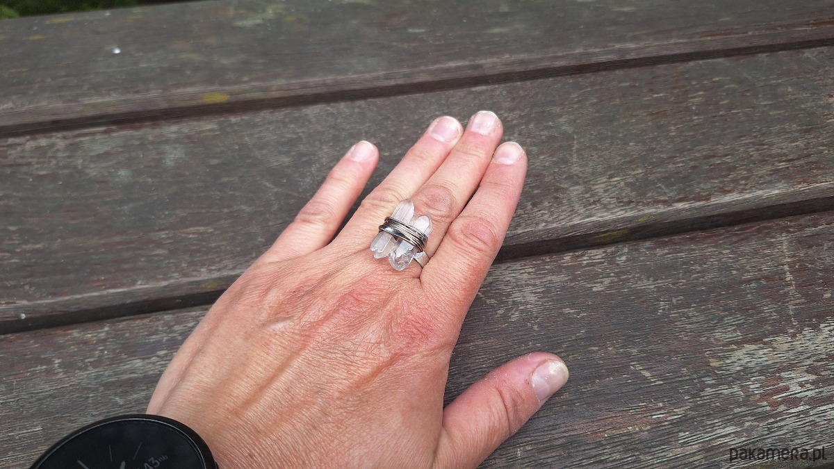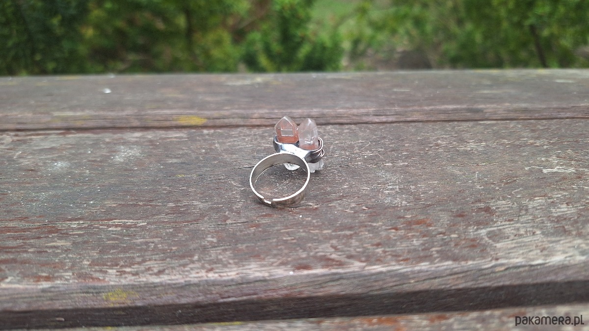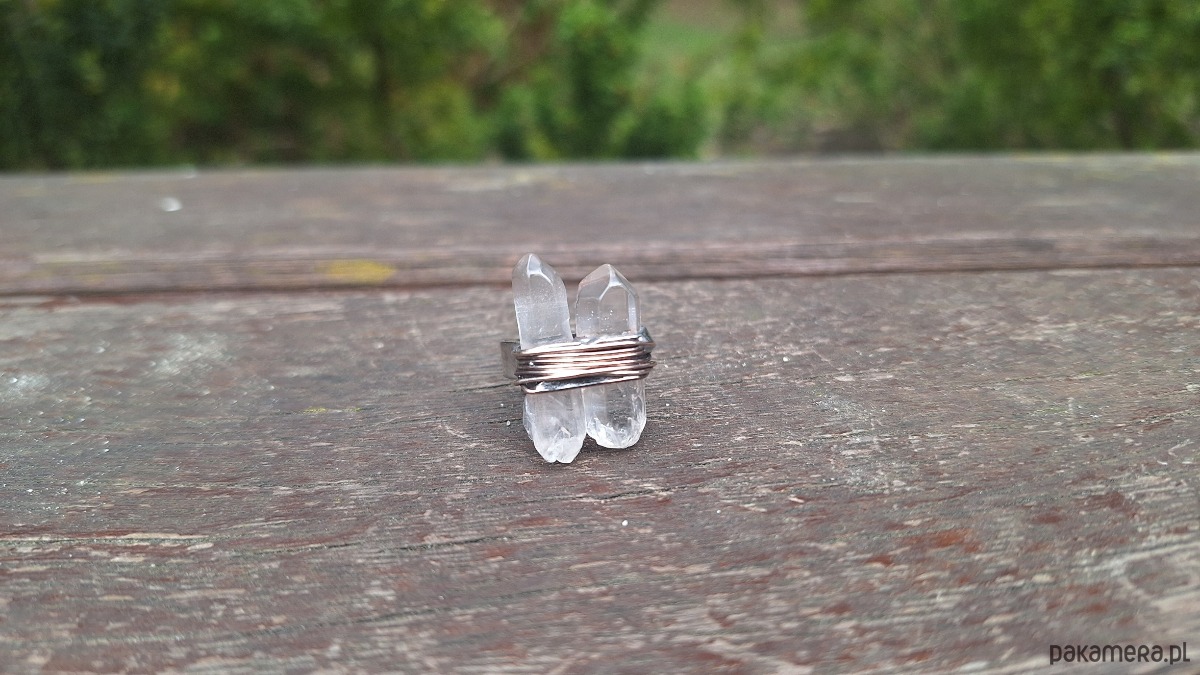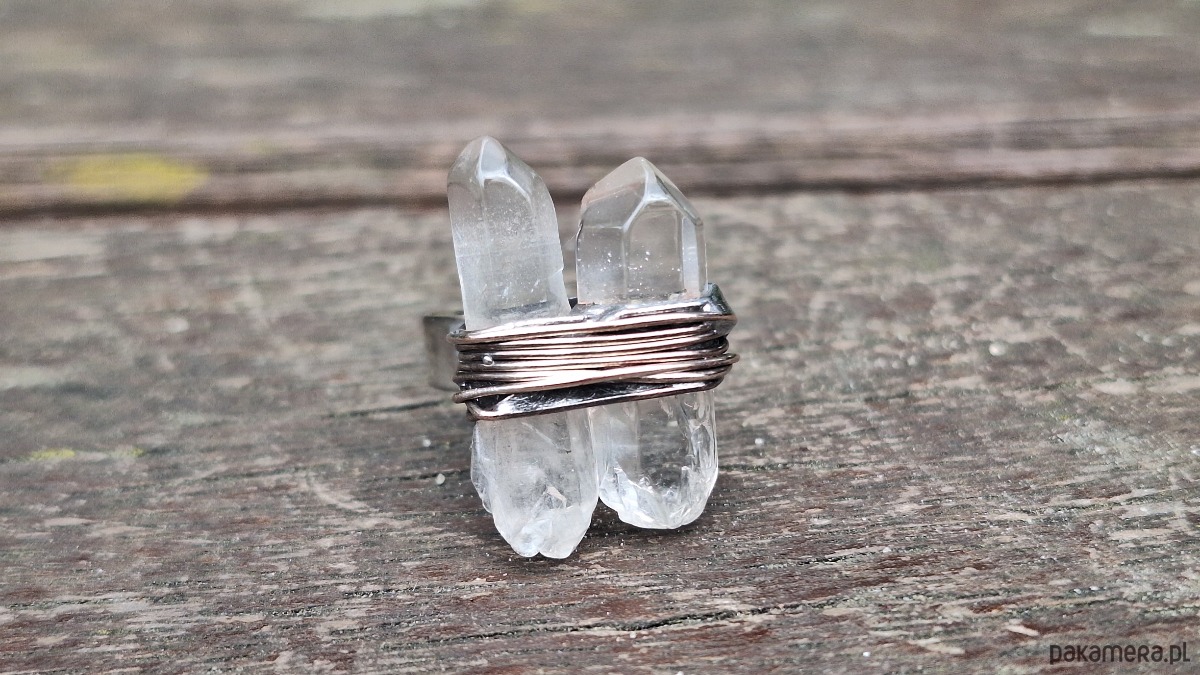 Pierścionek wykonany z miedzi, cyny i kryształu górskiego. Wymiary ok. 2.3 na 1.5 cm. Regulowany. Nie jest ciężki.