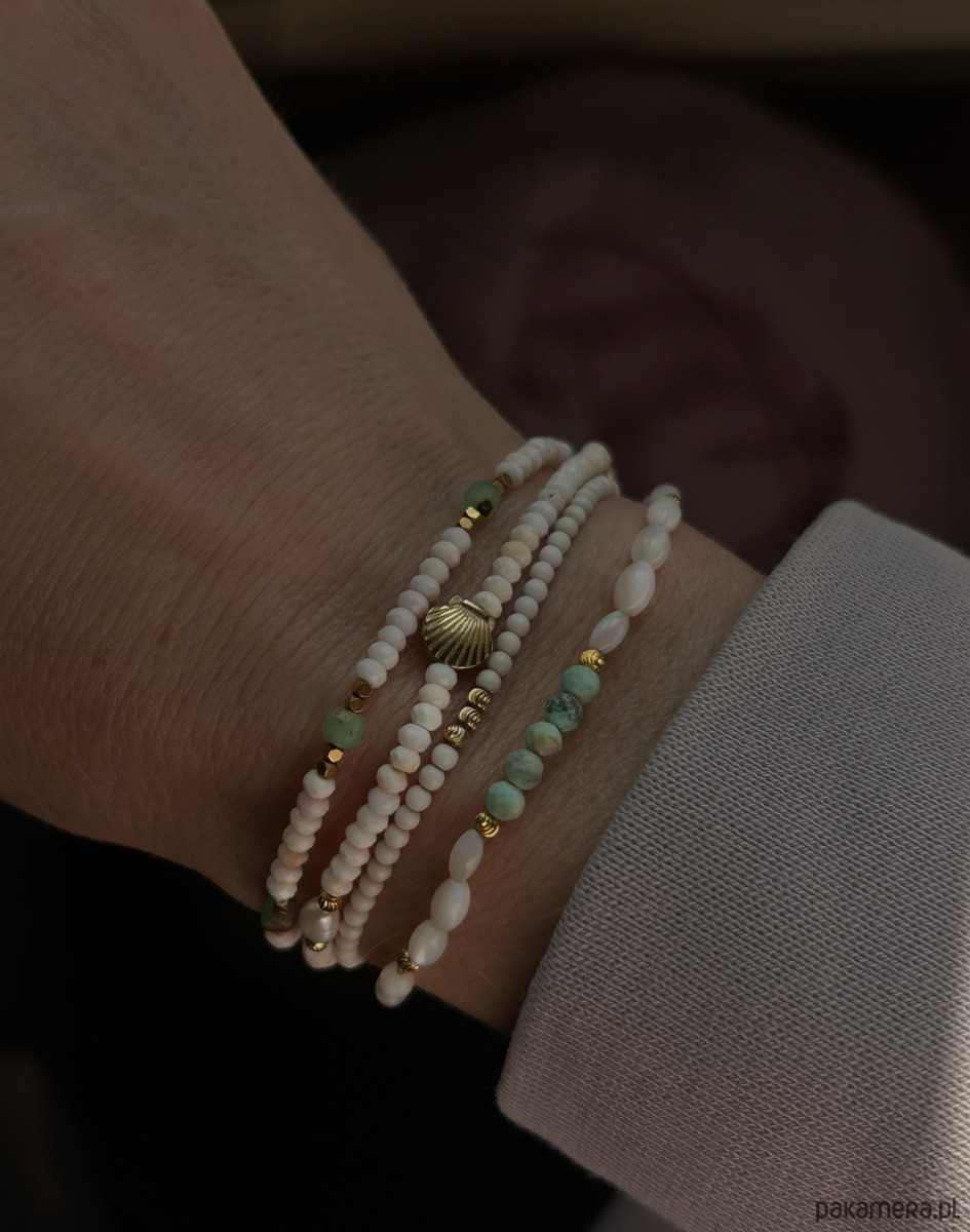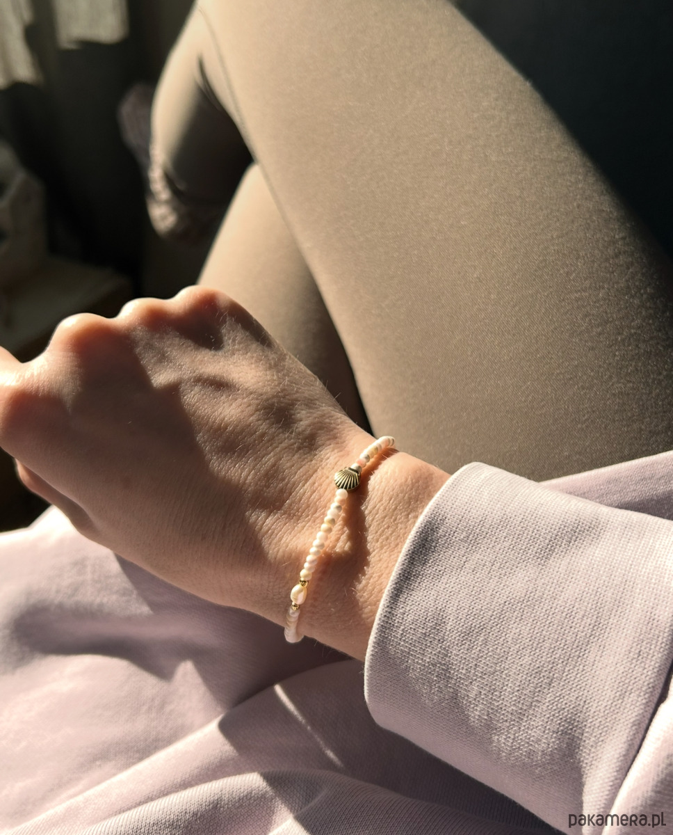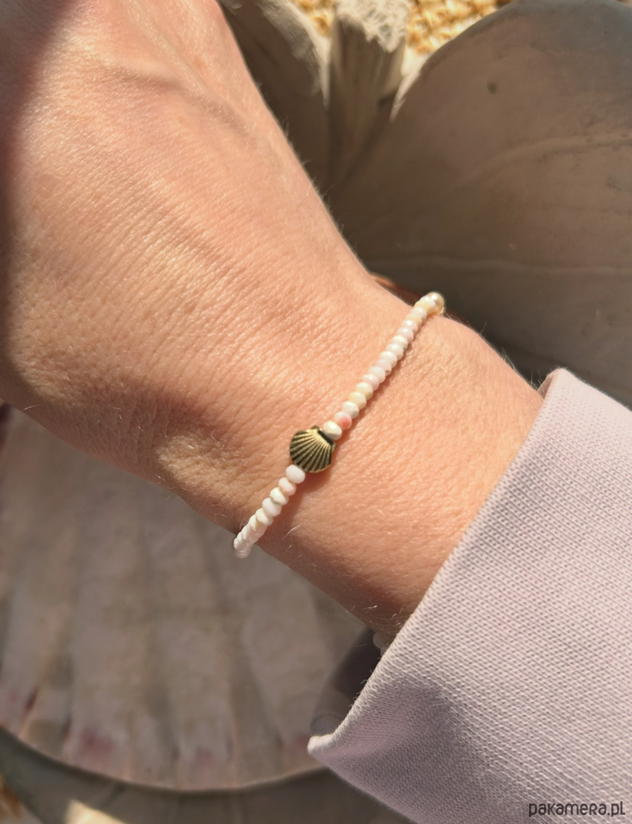 Bransoletka na jubilerskiej gumce, na nadgarstek około 16-16,5 cm. Muszla to symbol miłości, doskonale wzmacnia odczuwanie szczęścia i wewnętrznej harmonii. Perła kojarzona jest z elegancją, wewnętrznym pięknem i harmonią. Zwiększa intuicję i samoakceptację.