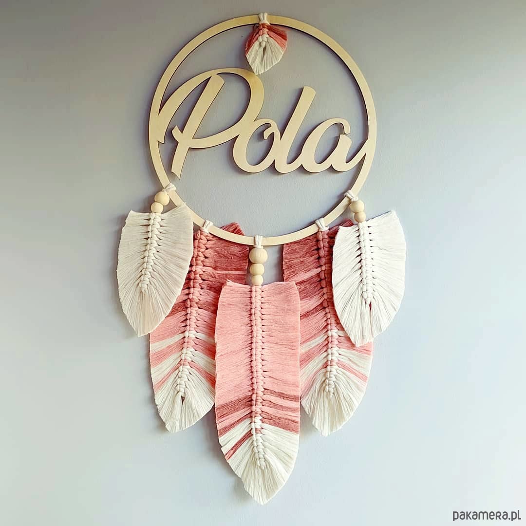 Duży brzoskwiniowy łapacz snów z personalizowanym napisem, metryczka