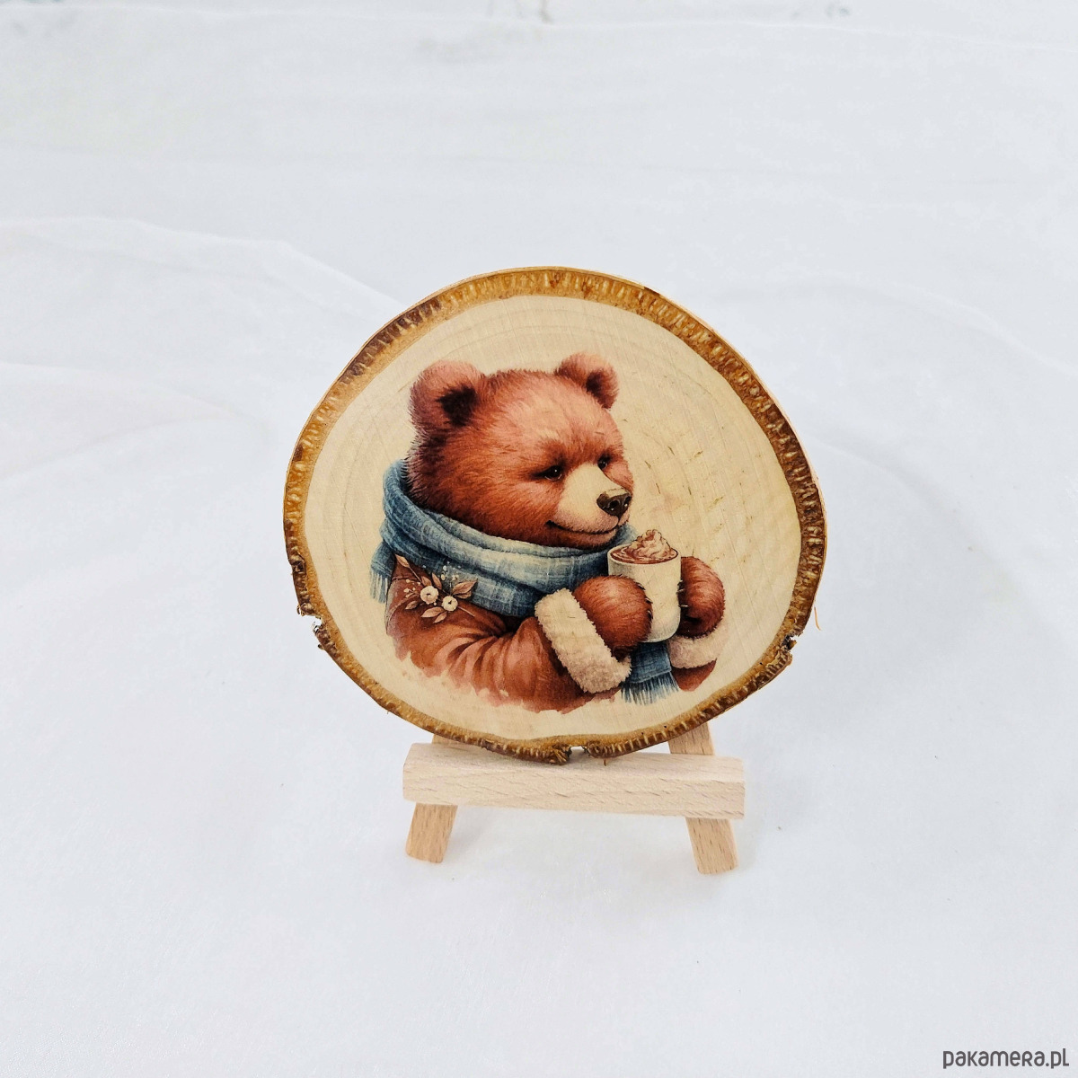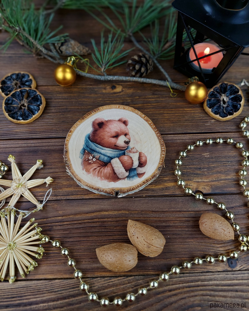 Brzozowa podkładka pod kubek, świąteczna zawieszka - niedźwiadek