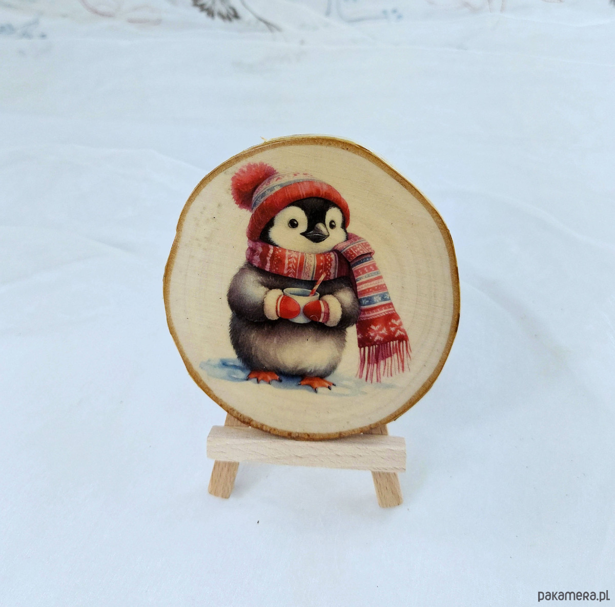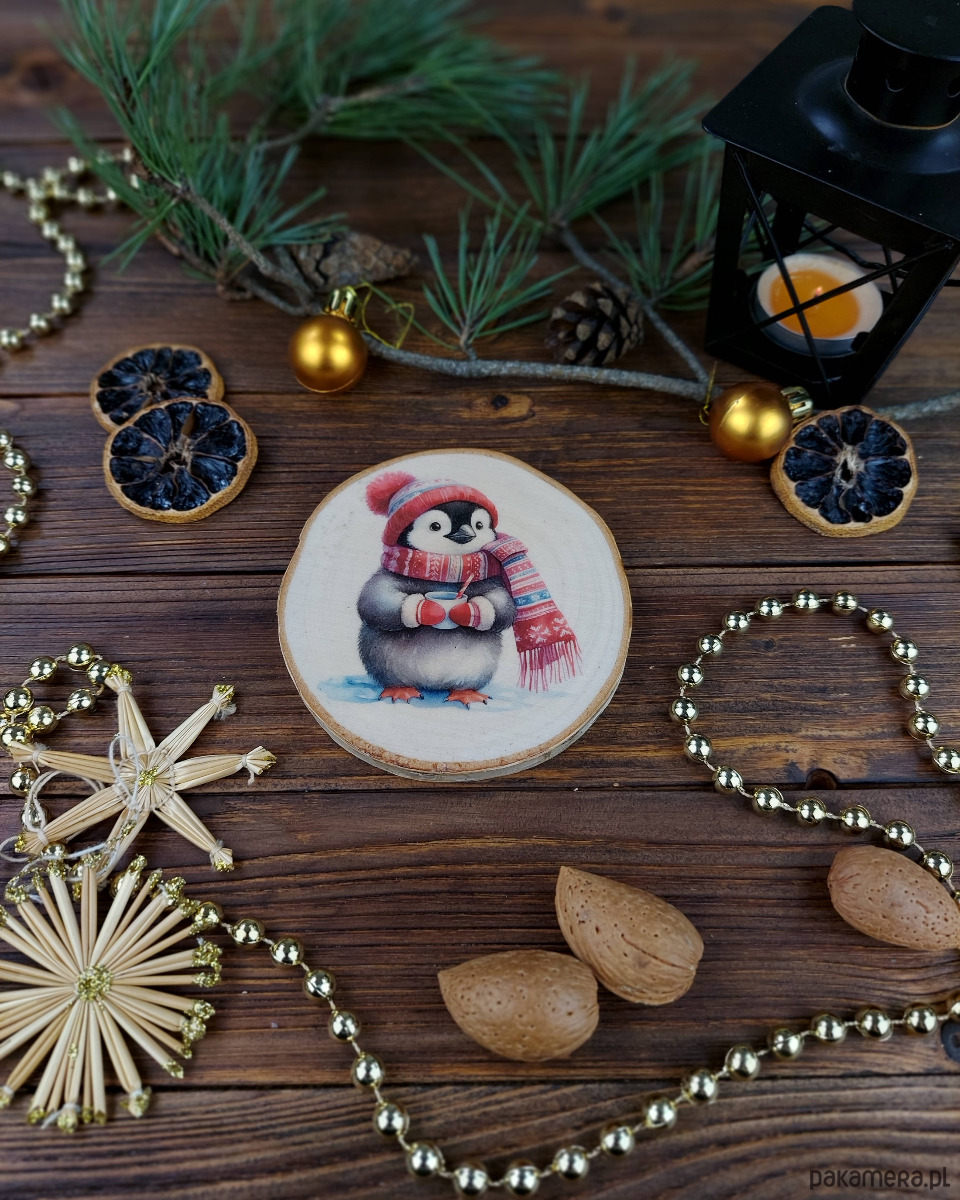 Brzozowa podkładka pod kubek, świąteczna zawieszka - pingwinek