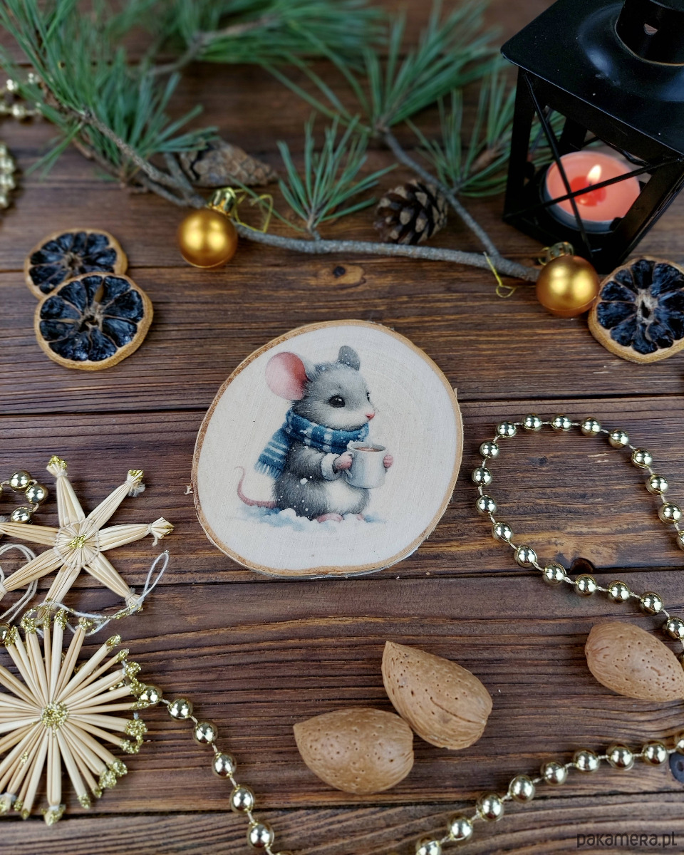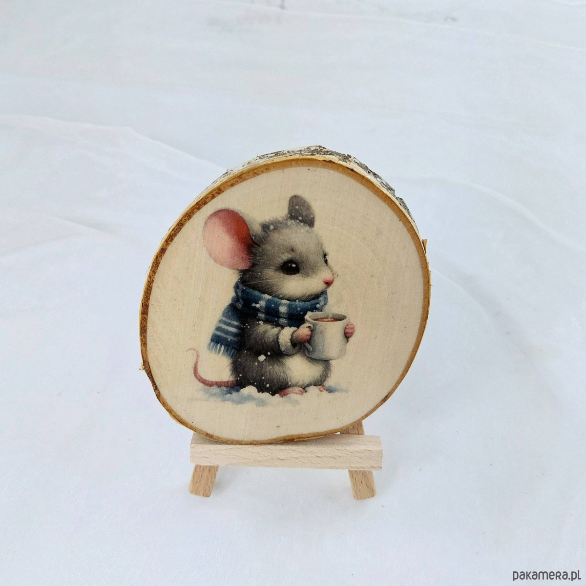 Brzozowa podkładka pod kubek, świąteczna zawieszka - zimowa myszka