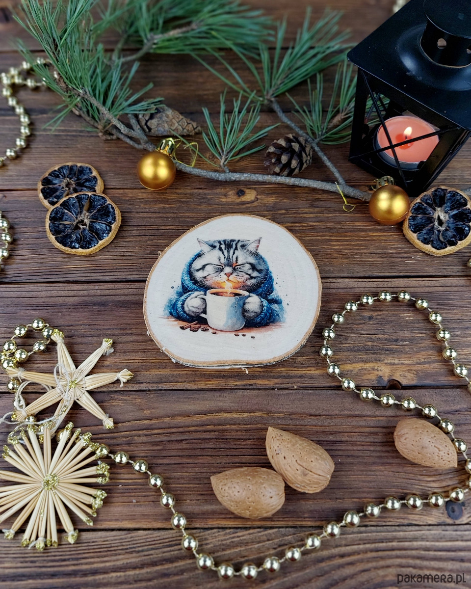 Brzozowa podkładka pod kubek, świąteczna zawieszka - zimowy kot