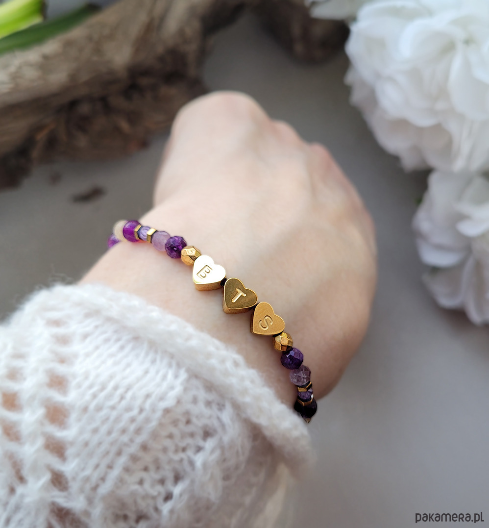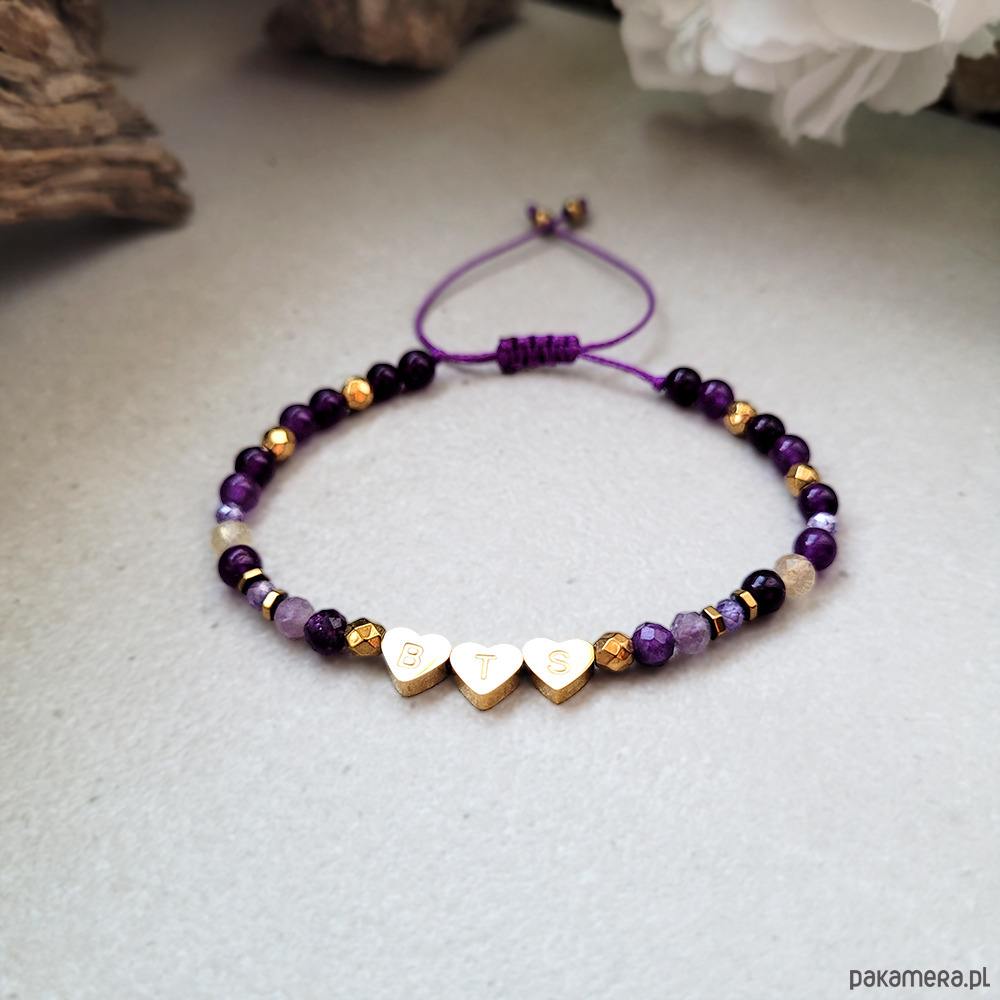 Bransoletka zrobiona z kamieni naturalnych: Ametystu, Cytrynu oraz Hematytu w kolorze złota oraz Cyrkonii. Kamienie sprzyjające spełnianiu marzeń. Na środku serduszka ze stali nierdzewnej w kolorze złota układające się w napis BTS.