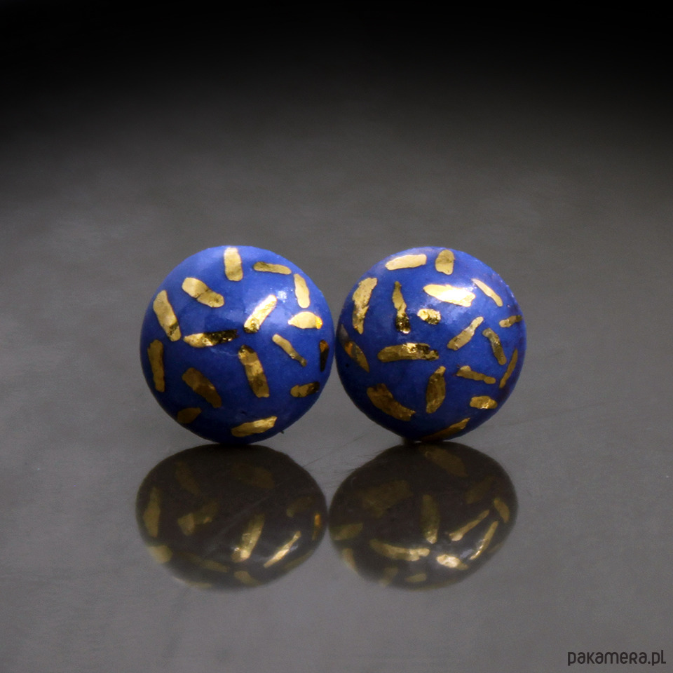 Ceramiczne okrągłe kolczyki w formie sztyftów, ręcznie wykonane z delikatnej barwionej porcelany, jednostronnie szkliwione i dekorowane złotym wzorem, na sztyftach w kolorze srebrnym. Średnica ok. 10mm. Polecam