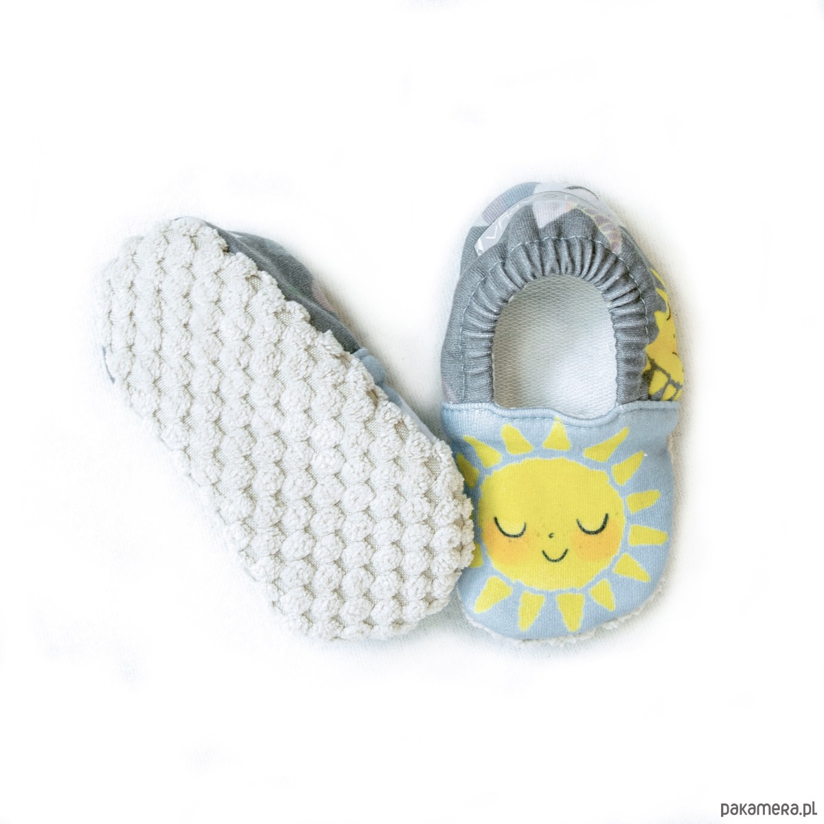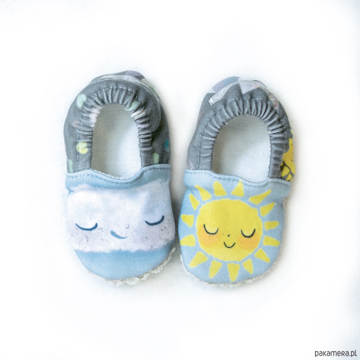 Buciki dziecięce z puchową podeszwą zapakowany w ładnym pudelku ze złotymi akcentami. Ilustracje są nasze oryginalne i drukowane cyfrowo.