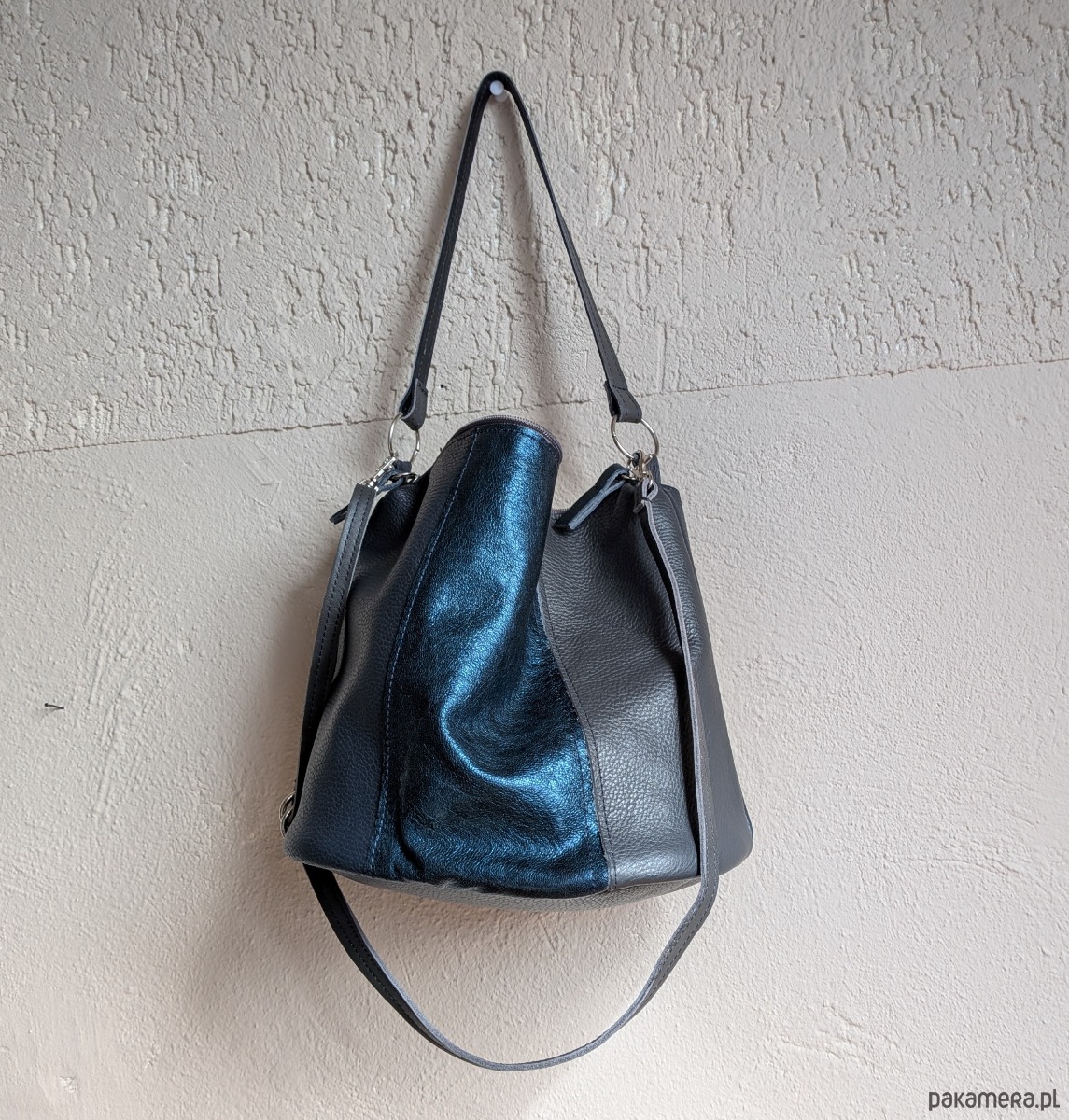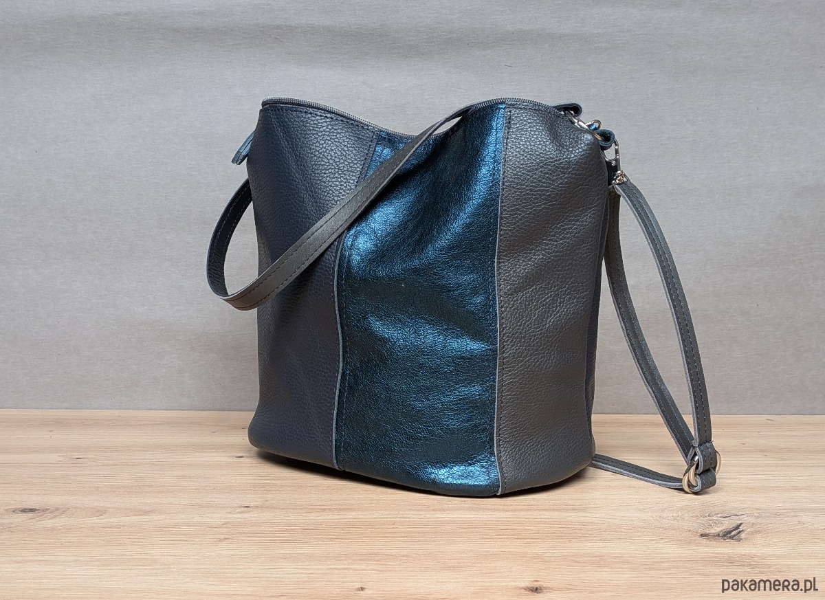 Grafitowo-granatowy z akcentem metalicznym torebka typu bucket.