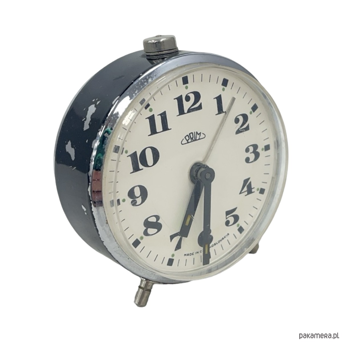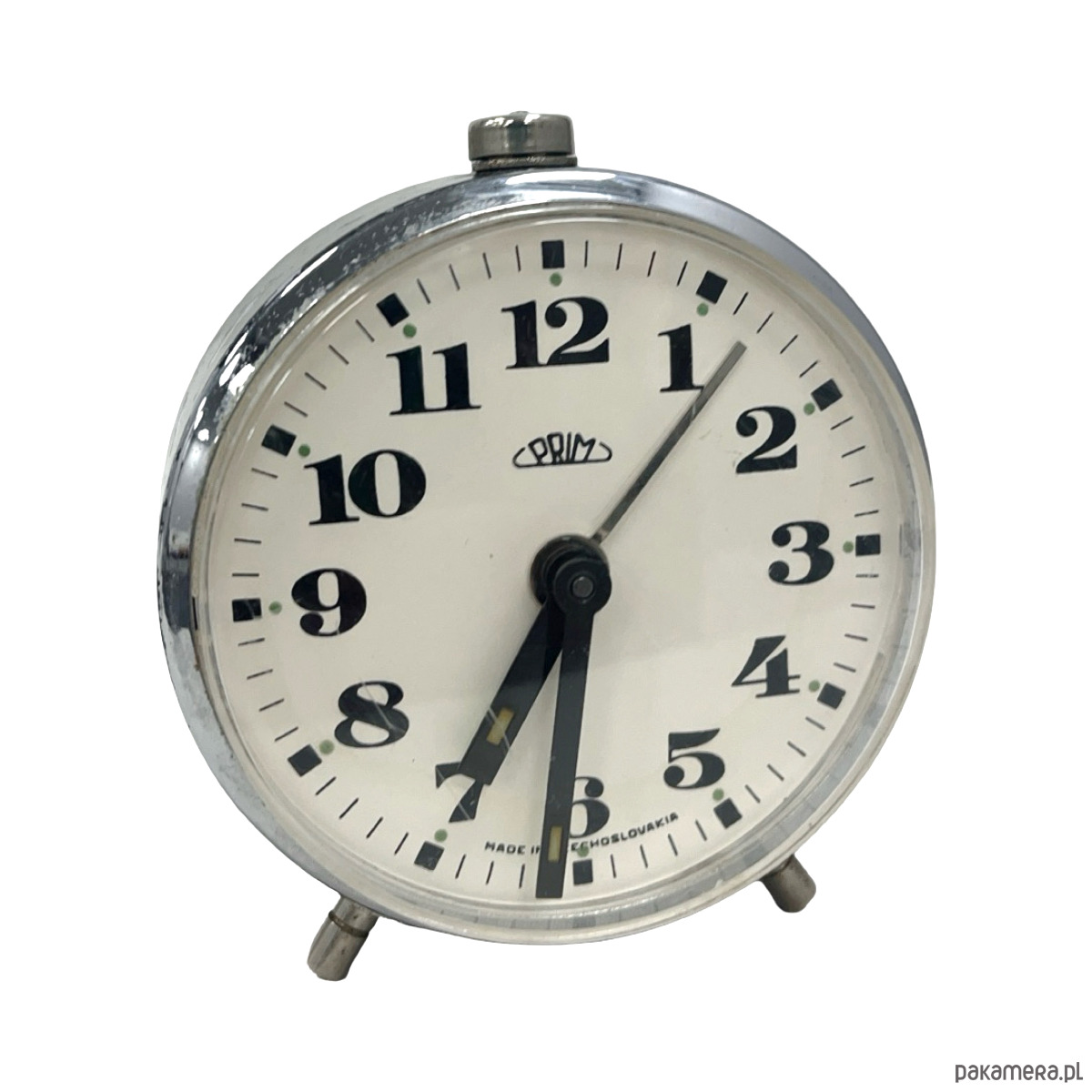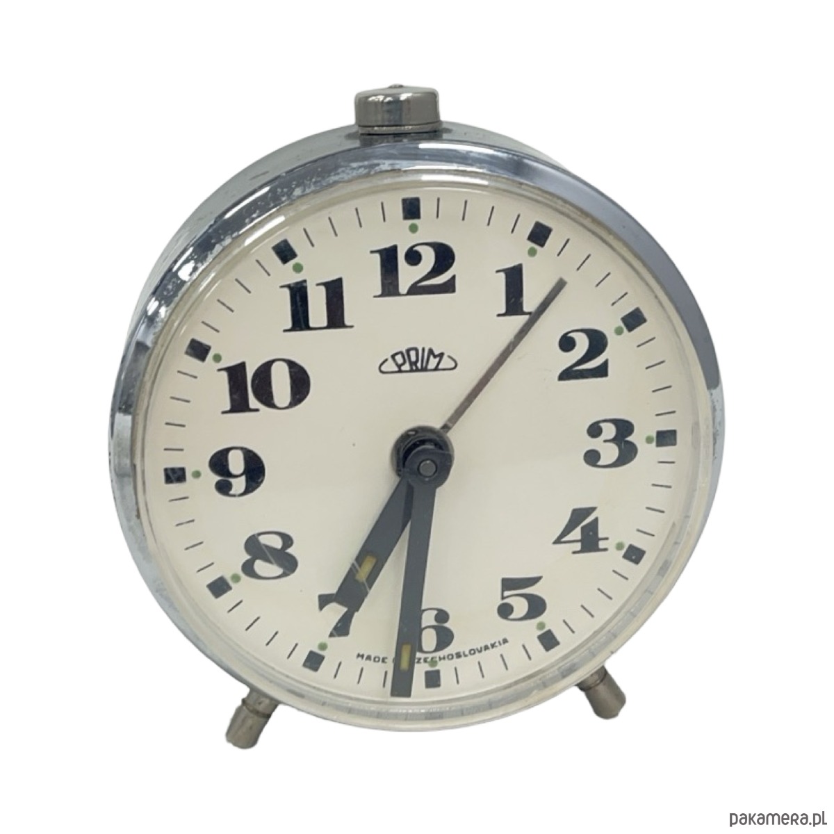 Klasyczny mechaniczny budzik marki PRIM, wyprodukowany w Czechosłowacji. Solidna, chromowana metalowa obudowa w kolorze srebrnym łączy się z kremową tarczą i dużymi, czarnymi cyframi arabskimi. Czytelne, czarne wskazówki oraz subtelne znaczniki minut podkreślają funkcjonalny charakter przedmiotu. Mechanizm nakręcany, typowy dla produkcji z lat 60.–70. XX wieku, ceniony za trwałość i charakterystyczną pracę. Widoczne ślady patyny i drobne oznaki użytkowania dodają autentyczności i kolekcjonerskiego charakteru. Idealny do wnętrz retro, PRL, loft oraz dla miłośników zegarów mechanicznych.