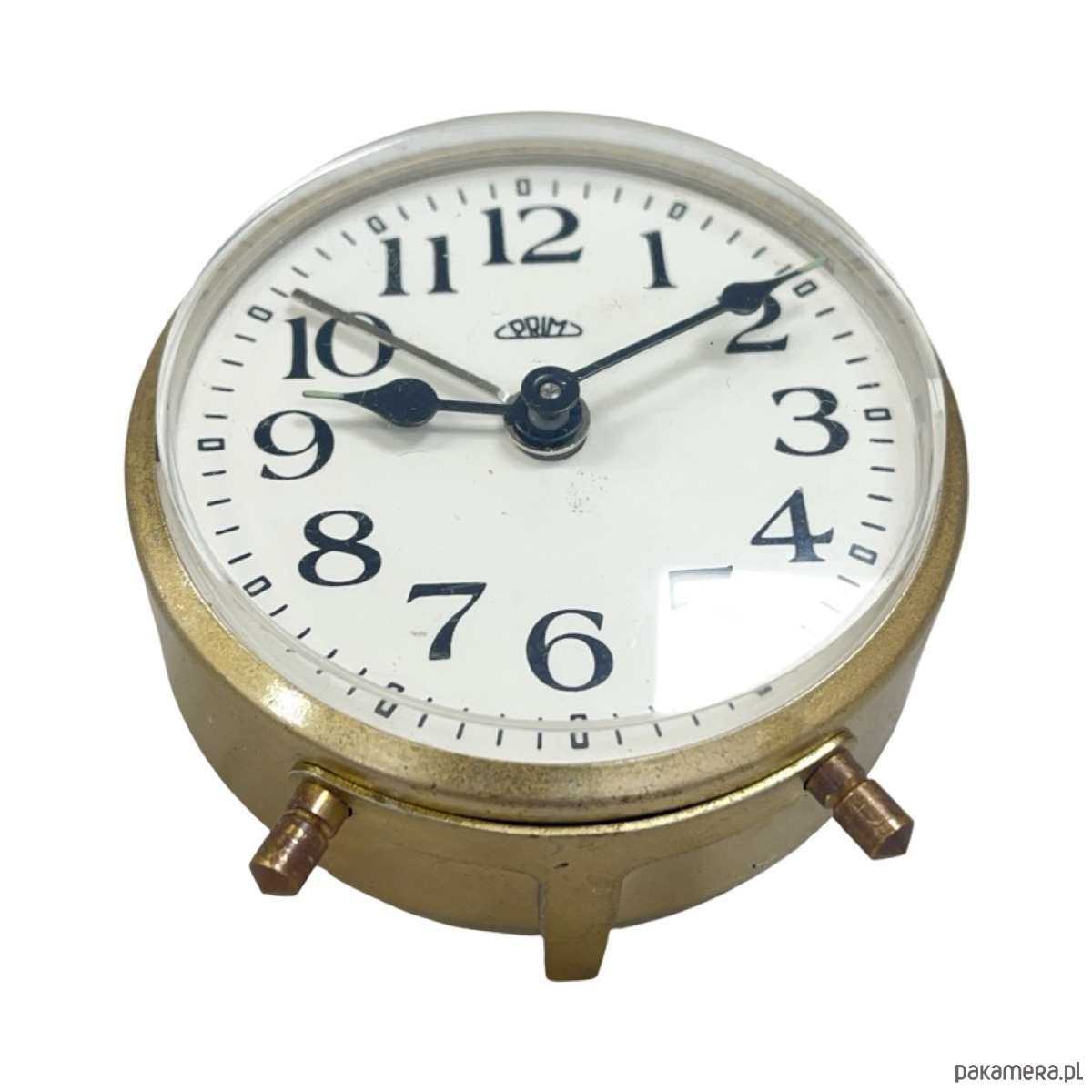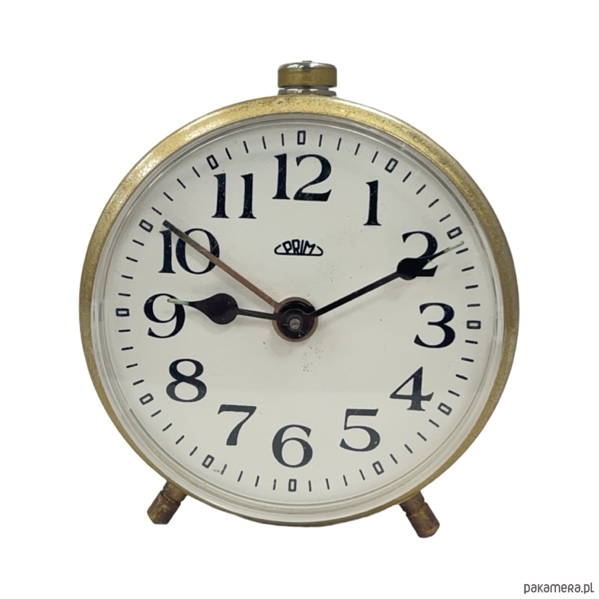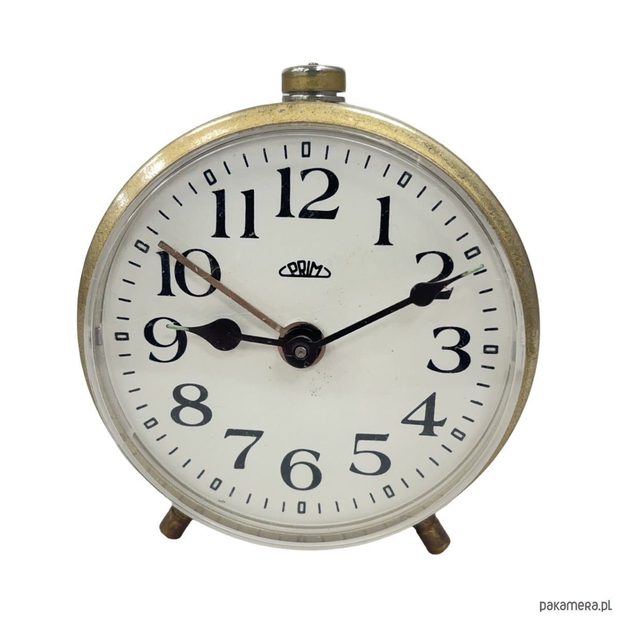Klasyczny mechaniczny budzik marki PRIM, wyprodukowany w Czechosłowacji. Solidna, metalowa obudowa w kolorze srebrnym łączy się z kremową tarczą i dużymi, czarnymi cyframi arabskimi. Czytelne, czarne wskazówki oraz subtelne znaczniki minut podkreślają funkcjonalny charakter przedmiotu. Mechanizm nakręcany, typowy dla produkcji z lat 60.–70. XX wieku, ceniony za trwałość i charakterystyczną pracę. Widoczne ślady patyny i drobne oznaki użytkowania dodają autentyczności i kolekcjonerskiego charakteru. Idealny do wnętrz retro, PRL, loft oraz dla miłośników zegarów mechanicznych.