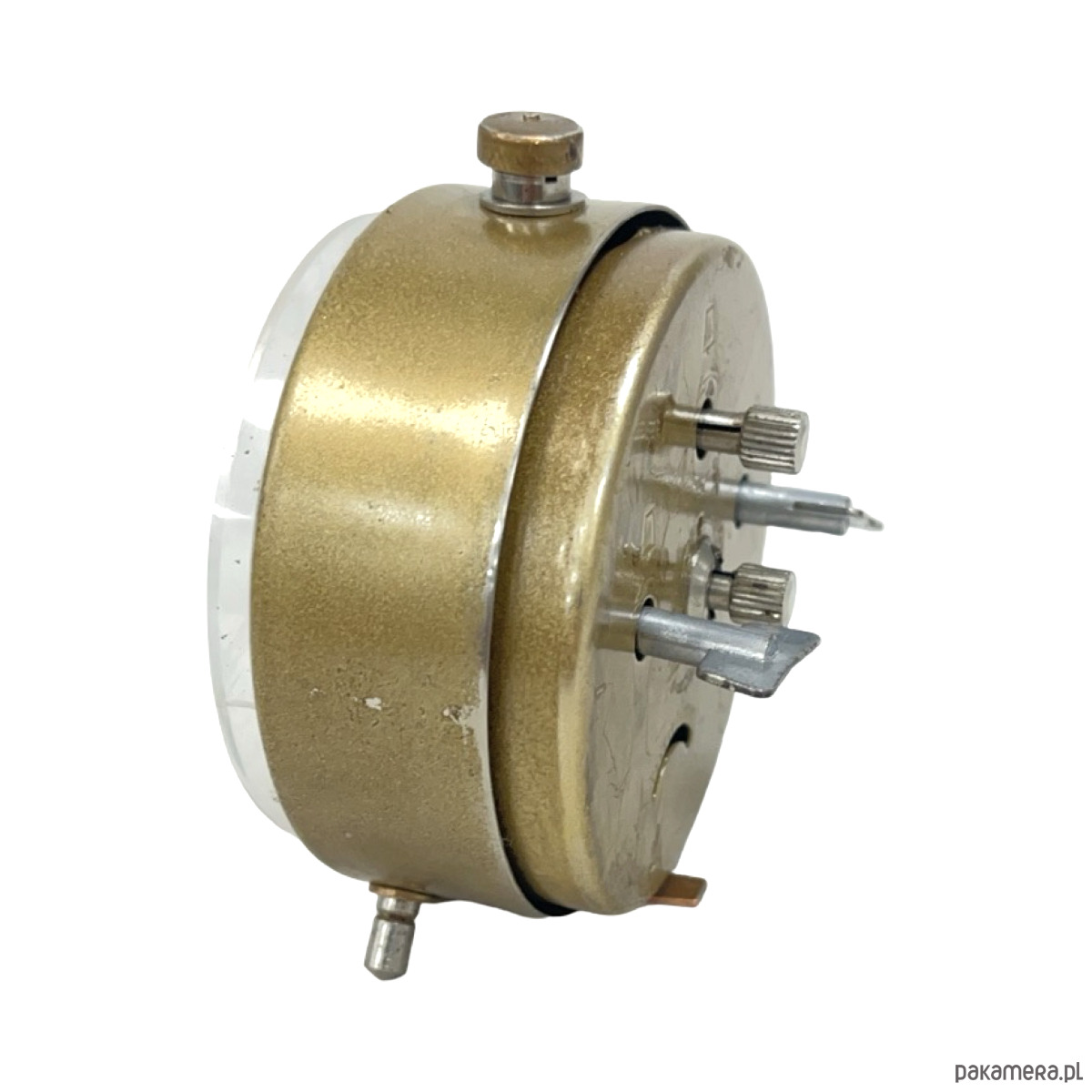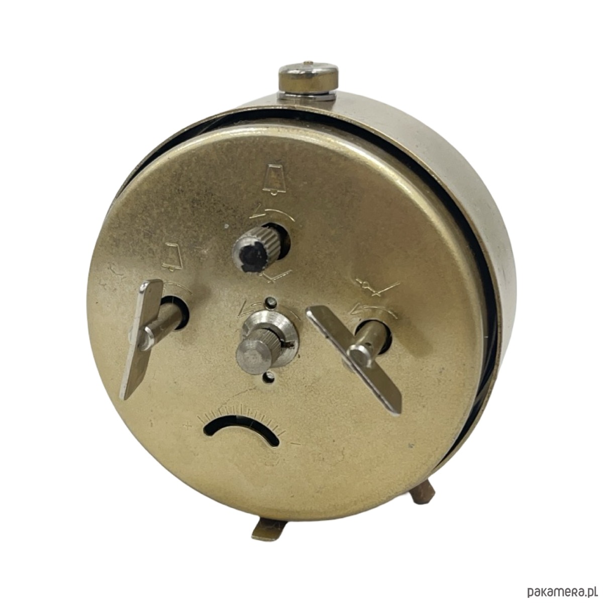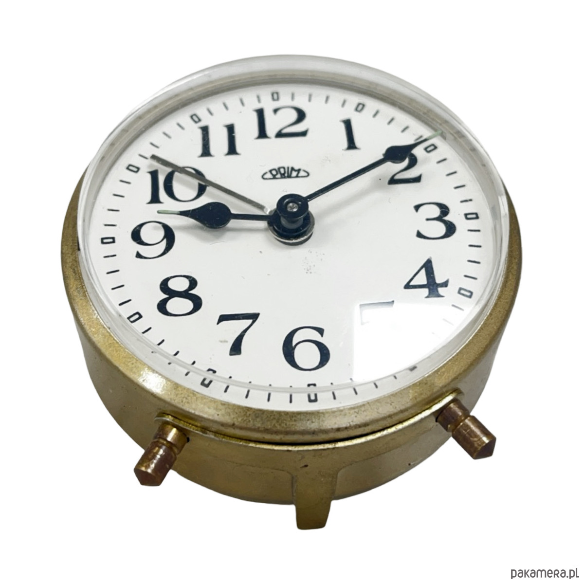 Klasyczny mechaniczny budzik marki PRIM, wyprodukowany w Czechosłowacji. Solidna, metalowa obudowa w kolorze srebrnym łączy się z kremową tarczą i dużymi, czarnymi cyframi arabskimi. Czytelne, czarne wskazówki oraz subtelne znaczniki minut podkreślają funkcjonalny charakter przedmiotu. Mechanizm nakręcany, typowy dla produkcji z lat 60.–70. XX wieku, ceniony za trwałość i charakterystyczną pracę. Widoczne ślady patyny i drobne oznaki użytkowania dodają autentyczności i kolekcjonerskiego charakteru. Idealny do wnętrz retro, PRL, loft oraz dla miłośników zegarów mechanicznych.