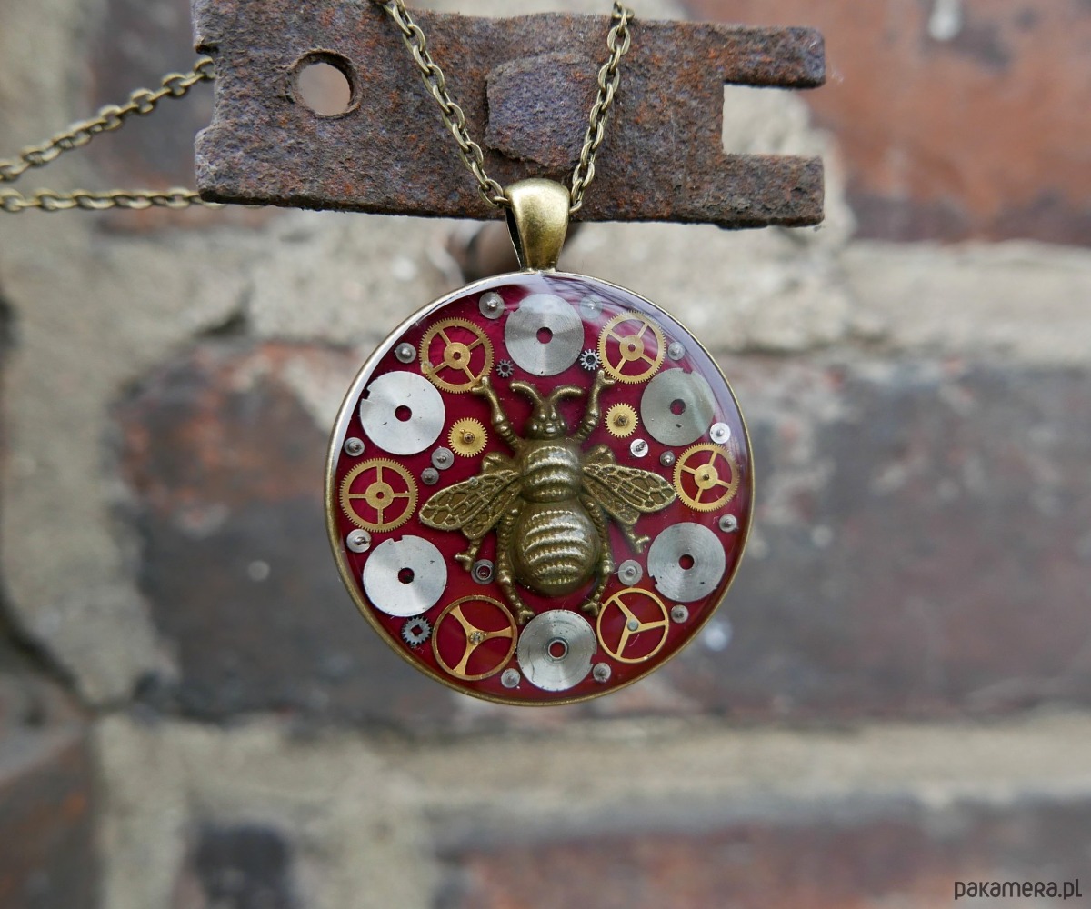 Wyjątkowy, ręcznie wykonany naszyjnik w stylu steampunk. W owalnej zawieszce zamknięto kompozycję z oryginalnych części mechanizmu zegarka i metalowego żuka.
